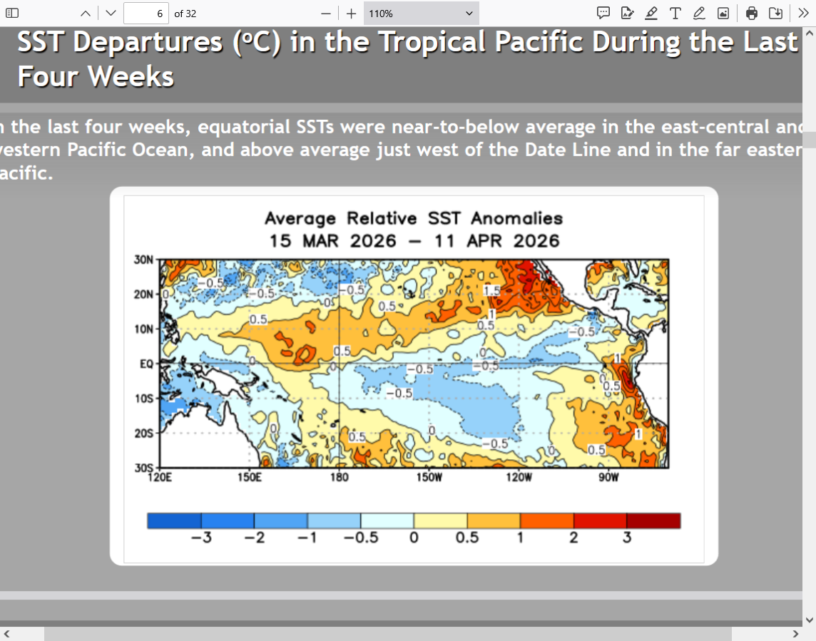 One of the few places with a colder than average ocean on the planet right now is the most important one. The East/Central tropical Pacific that determines La Nina/El Nino. But this is rapidly warming!