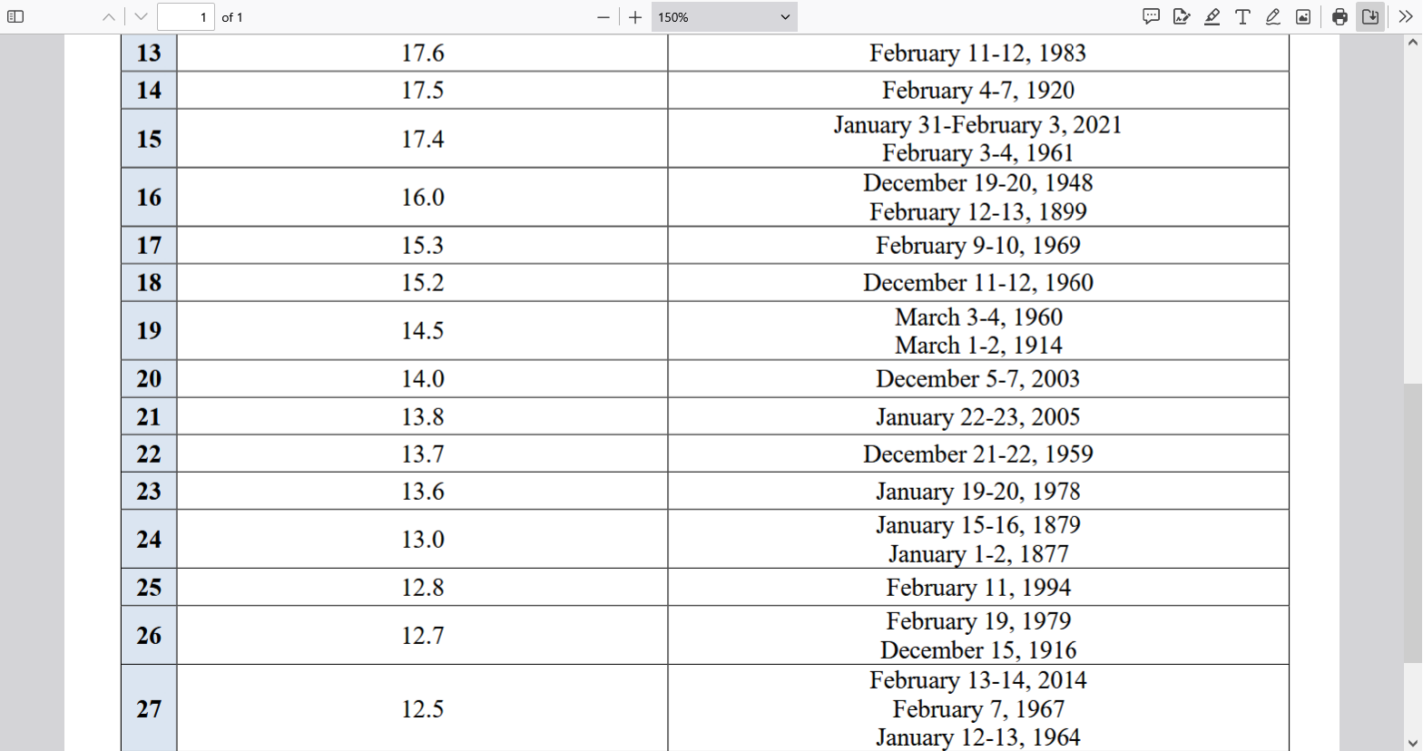 | 4 | 21.0 | March 12-14, 1888 |