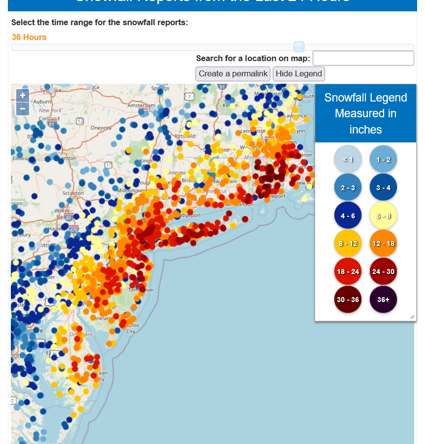 Any dark red dots are 2+ feet of snow! And still snowing in the far Northeast!