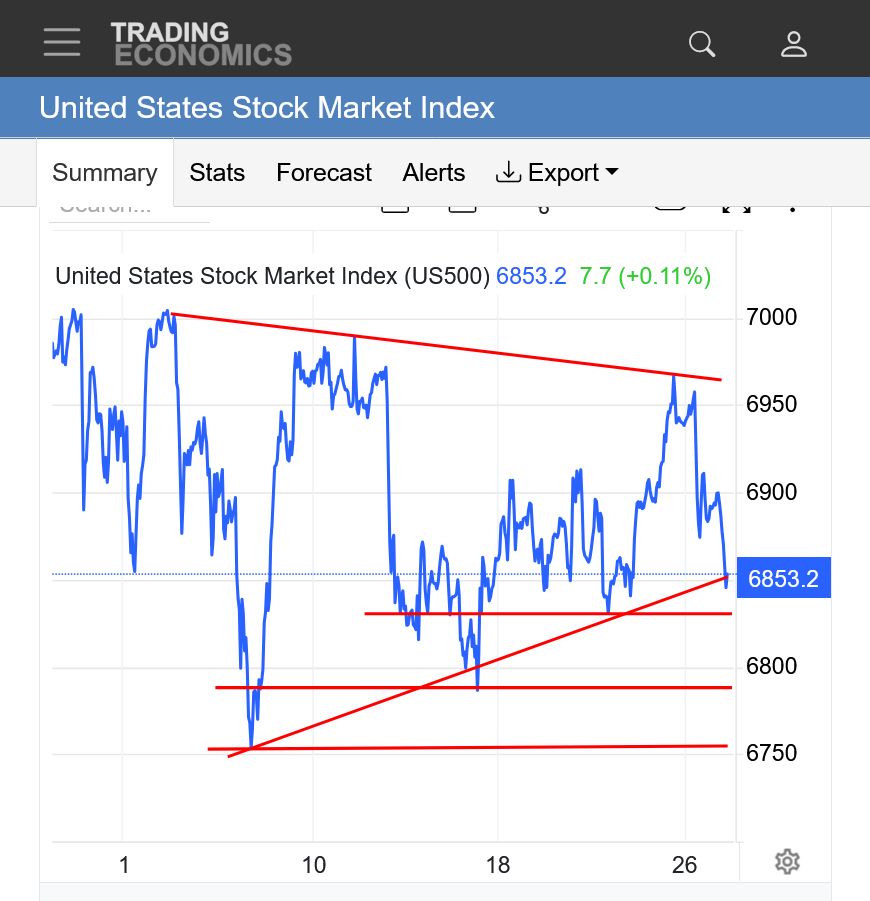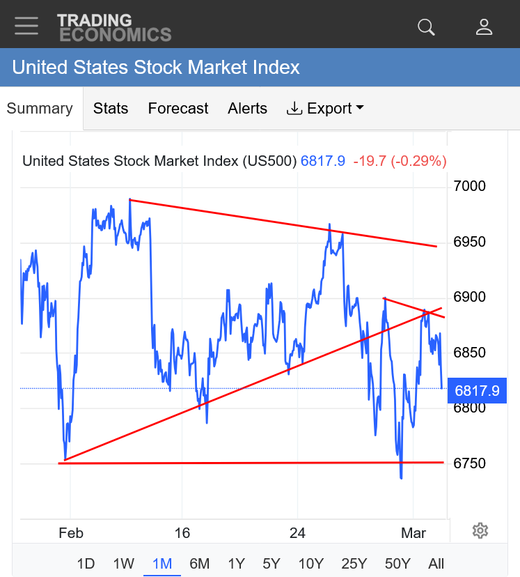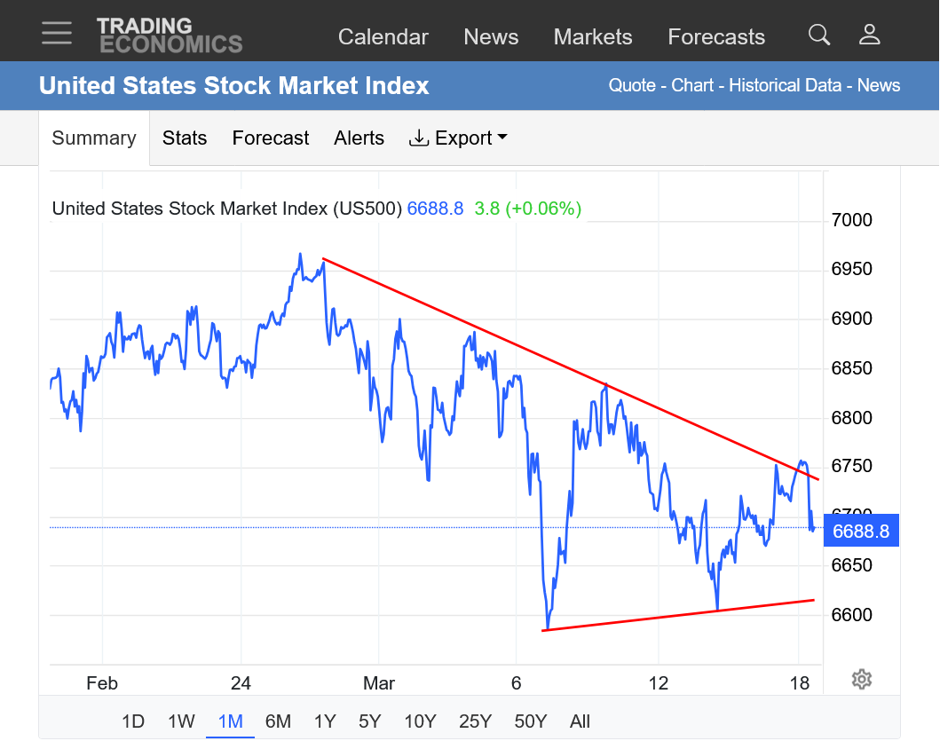NEWS still rules but the symmetrical triangle noted from yesterday is looking the most likely in the absence of more powerful NEWS. With a strong downside bias. If the war in Iran continues, along with oil supplies disrupted, a downside break out is inevitable.