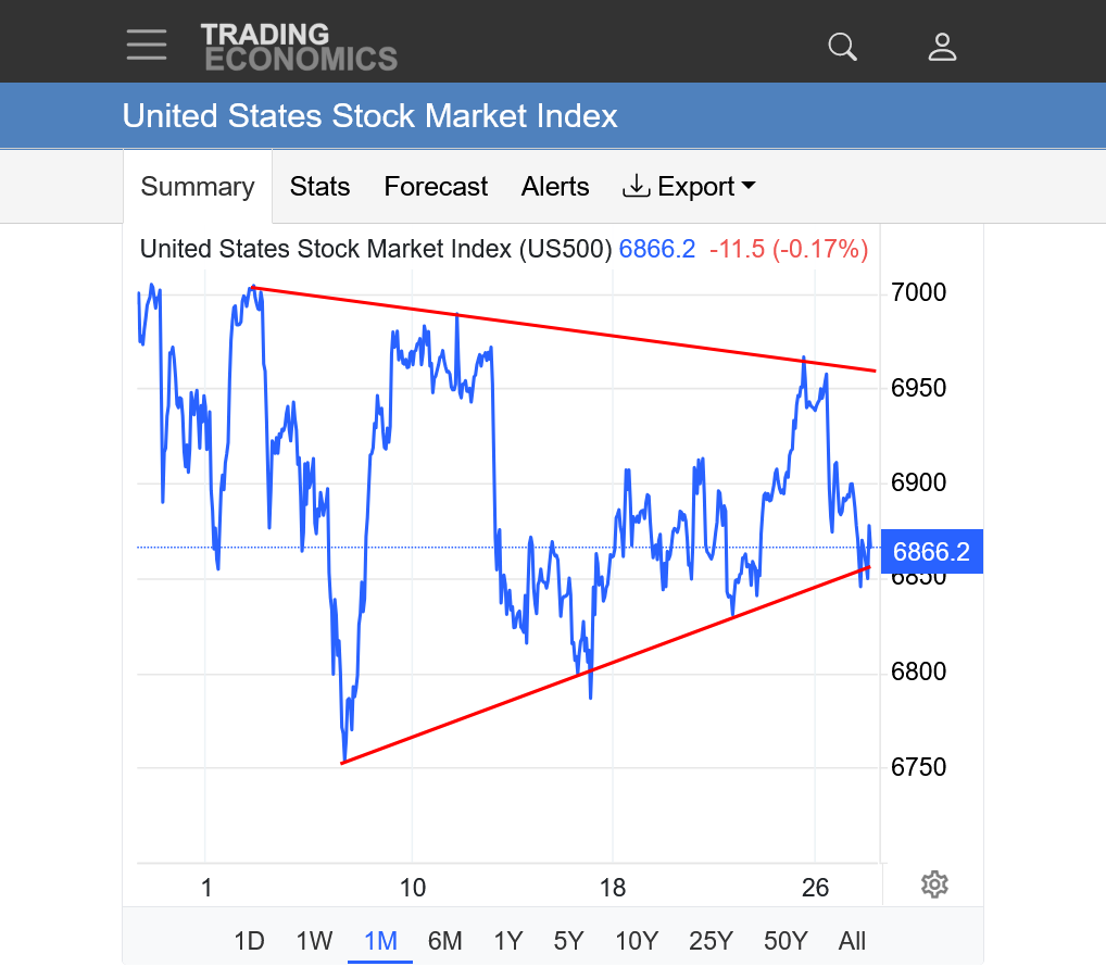 1. 1 year: Rounding top formation with the market coiling this MONTH/symmetrical triangle. The market has lost momentum with a decreasing upslope in 2025 and now, possibly rounding to the other side of the potential top with a downslope favored early in 2026.
