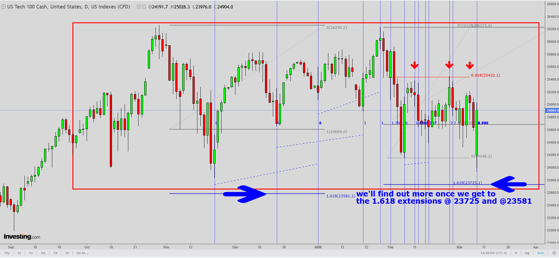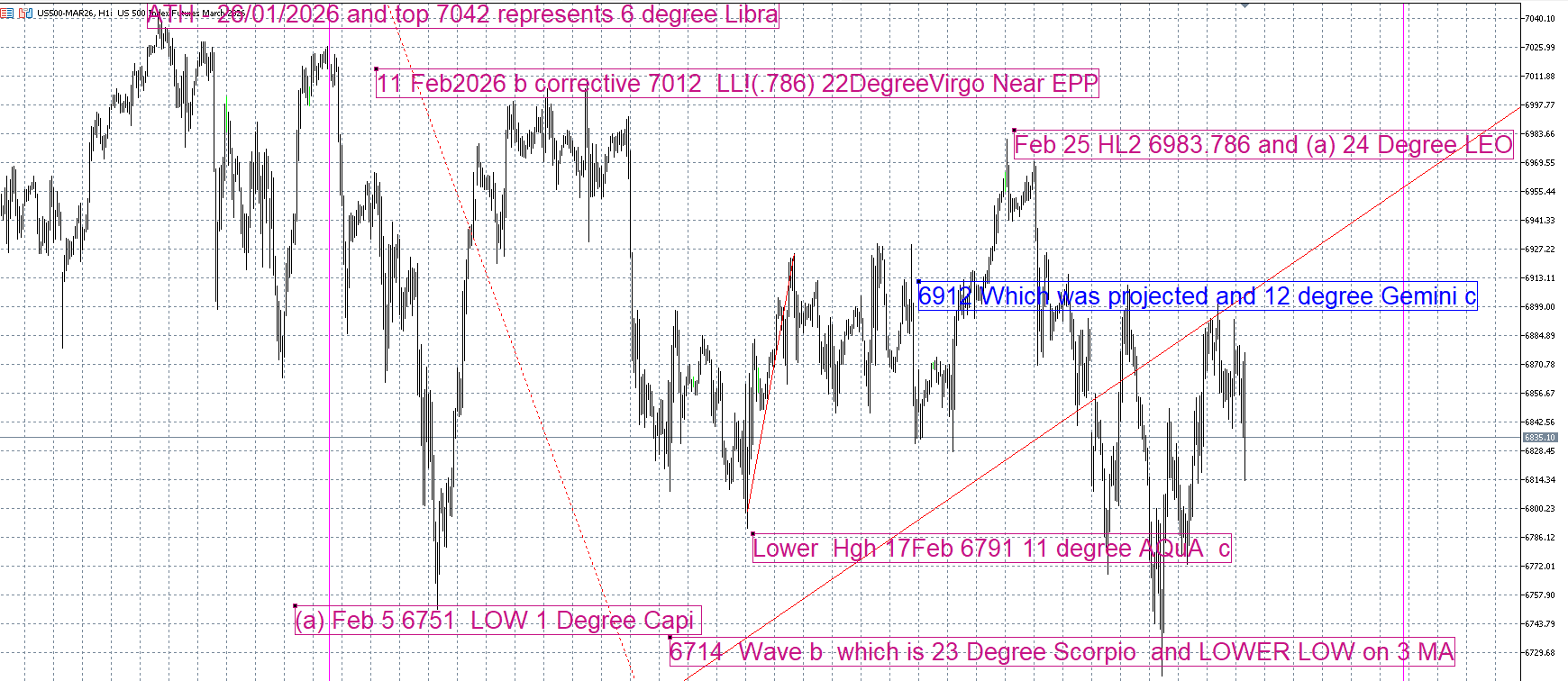 IF,IF, Monday were 'the' low, Wednesday night/Thursday 'dip' will be the time to initiate a long position---a March 20 call might be a method rather than an outright long--use stop. IF Monday proves to be 'the' low, it comes 16 weeks after the last weekly low November 21, 2025, 6525 futures. Thus SP remains in upward trend.