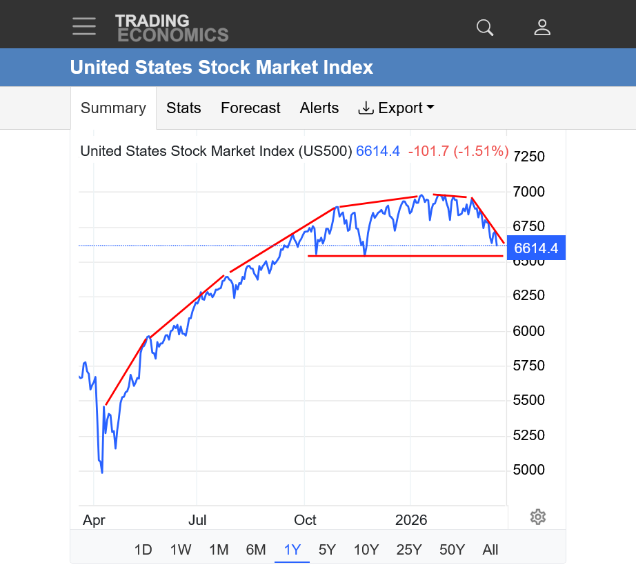 2. 1 year: The rounded top formation continues to be confirmed. The stock market has no only lost steam/momentum from an uptrend that became less and less steep in 2025, we are now in the DOWN trend on the other side of the high/peak. The only thing that will negate this very profound chart pattern is new, definitive highs that continue higher which seems almost possible to imagine with so many dark Donald Trump clouds raining on the economic parade.