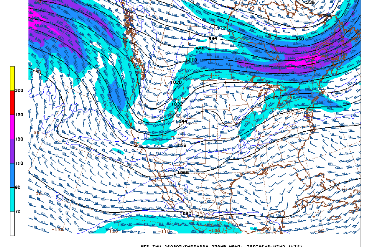 There is a weak jet streak in blue that's just under 100 mph(the units below are in KNOTS).