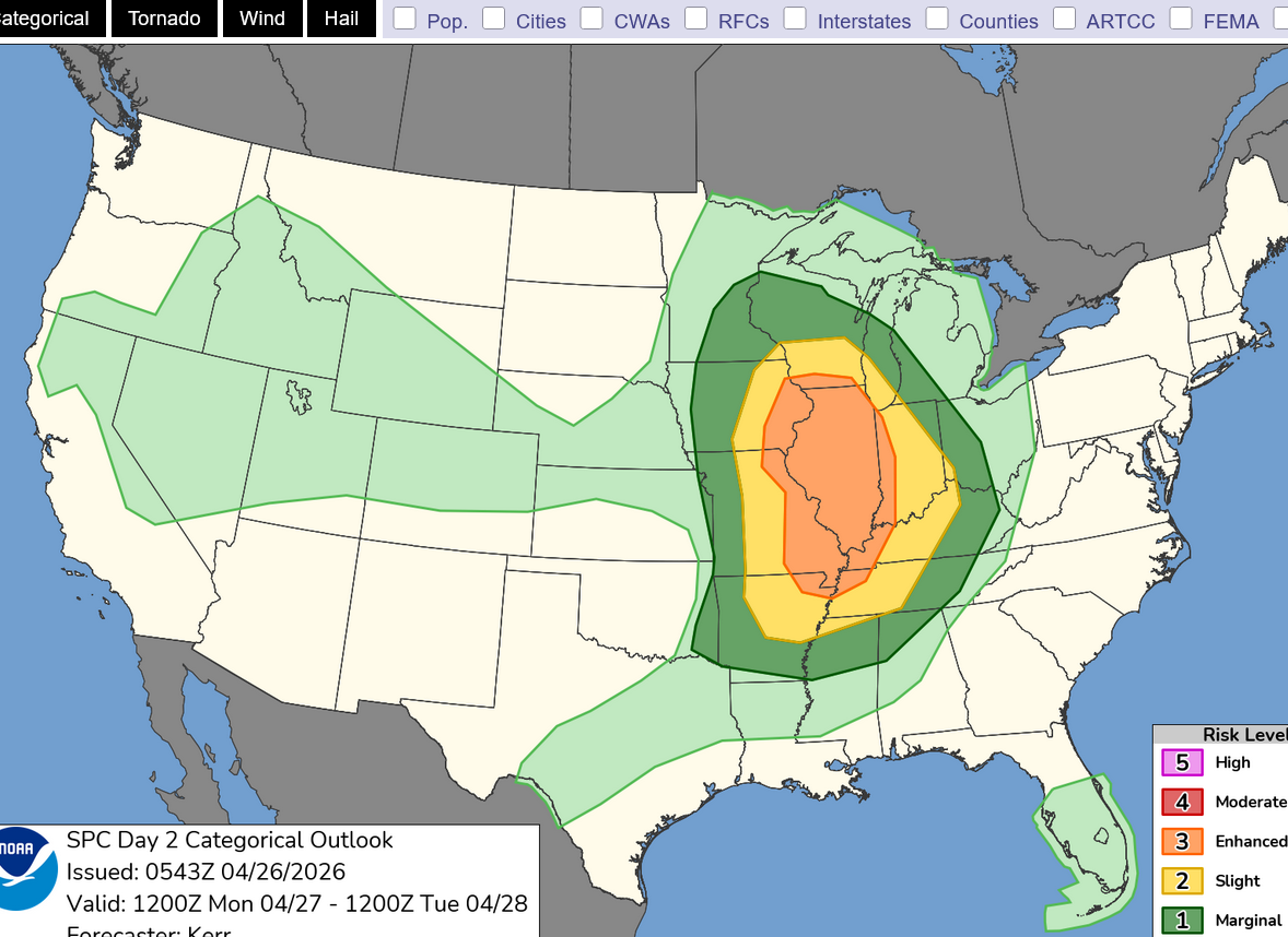 That red shade is over southwest IL/southeast MO. Areas in the surrounding orange, level 3 out of 5 enhanced could also see an EF3 tornado(150 mph). Mother Nature will not be strictly following the map below even though that map captures our wonderful, constantly improving technology used to predict weather with increasing accuracy.