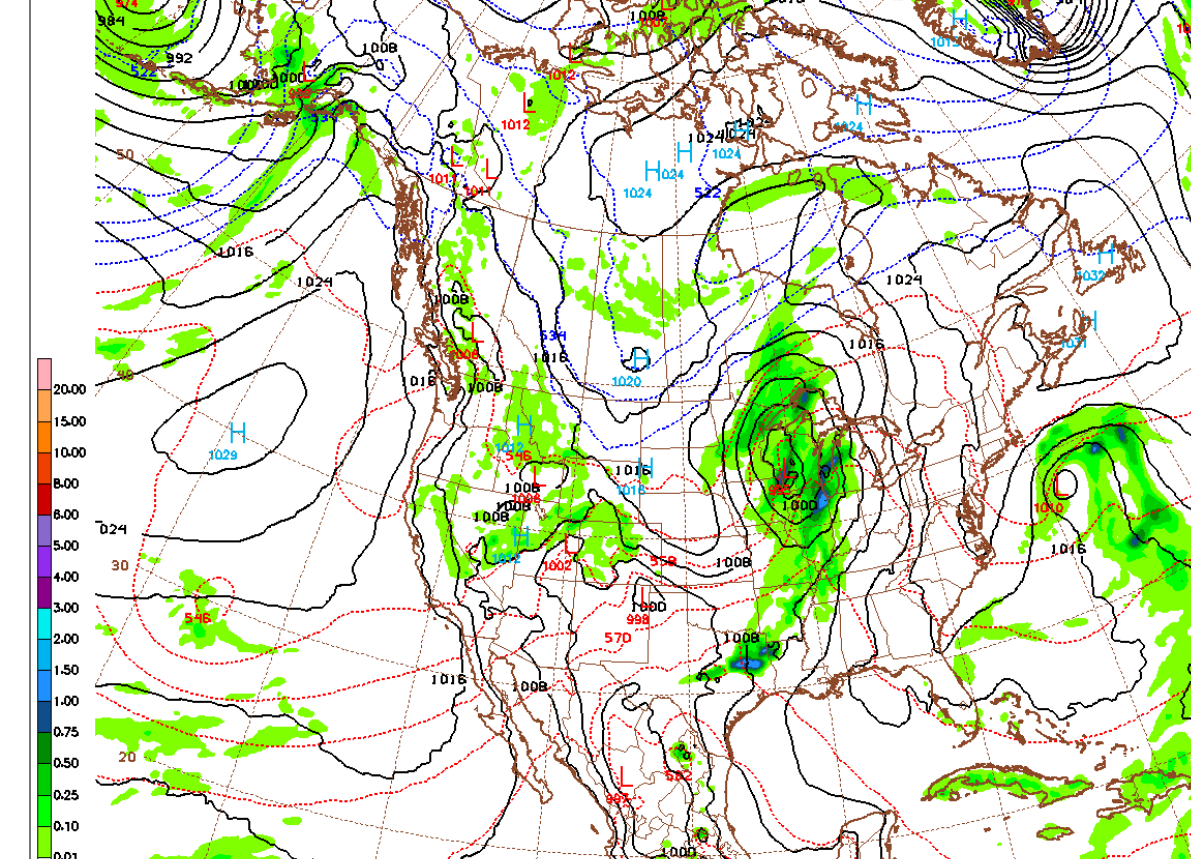 Surface map late Monday, 12z GFS model forecast. Cold front crossing the Mississippi River into IL.