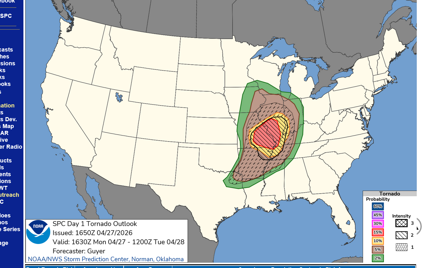 4-27-26: An EF5 tornado of 200 mph is NOT likely today because the magnitude of the jet stream, instability and other elements that play a role, while being robust for 150 mph tornadoes, fall short of the extremes we usually see that generate the most deadly tornadoes of all. It's not impossible, just unlikely. Again, don't be scared just be prepared.