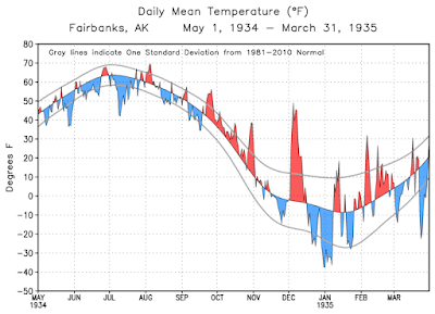 A few weeks ago reader Mike suggested that we take a look at the great chinook event of December 1934, which brought record-breaking warmth to interior Alaska and led to the only "brown" Christmas in Fairbanks history. The magnitude of the warm anomaly was so extreme that nothing really comparable has happened in the 8 decades since.