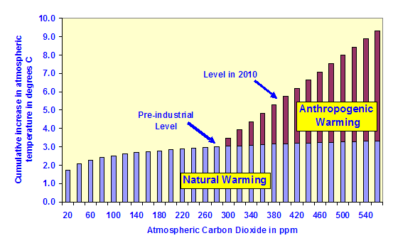 If we doubled the current amount of CO2(which never happen as fossil fuels will run out before then) to approach the optimal level for life, the greenhouse warming impact for each additional molecule would be less than half of what the added impact is at the current level for each molecule.