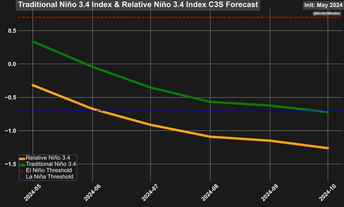 Forecasters on Thursday put 65% odds on #LaNina's establishment between July-Sept, and the odds are greater than 80% that La Nina will be in place at the end of 2024/start of 2025.