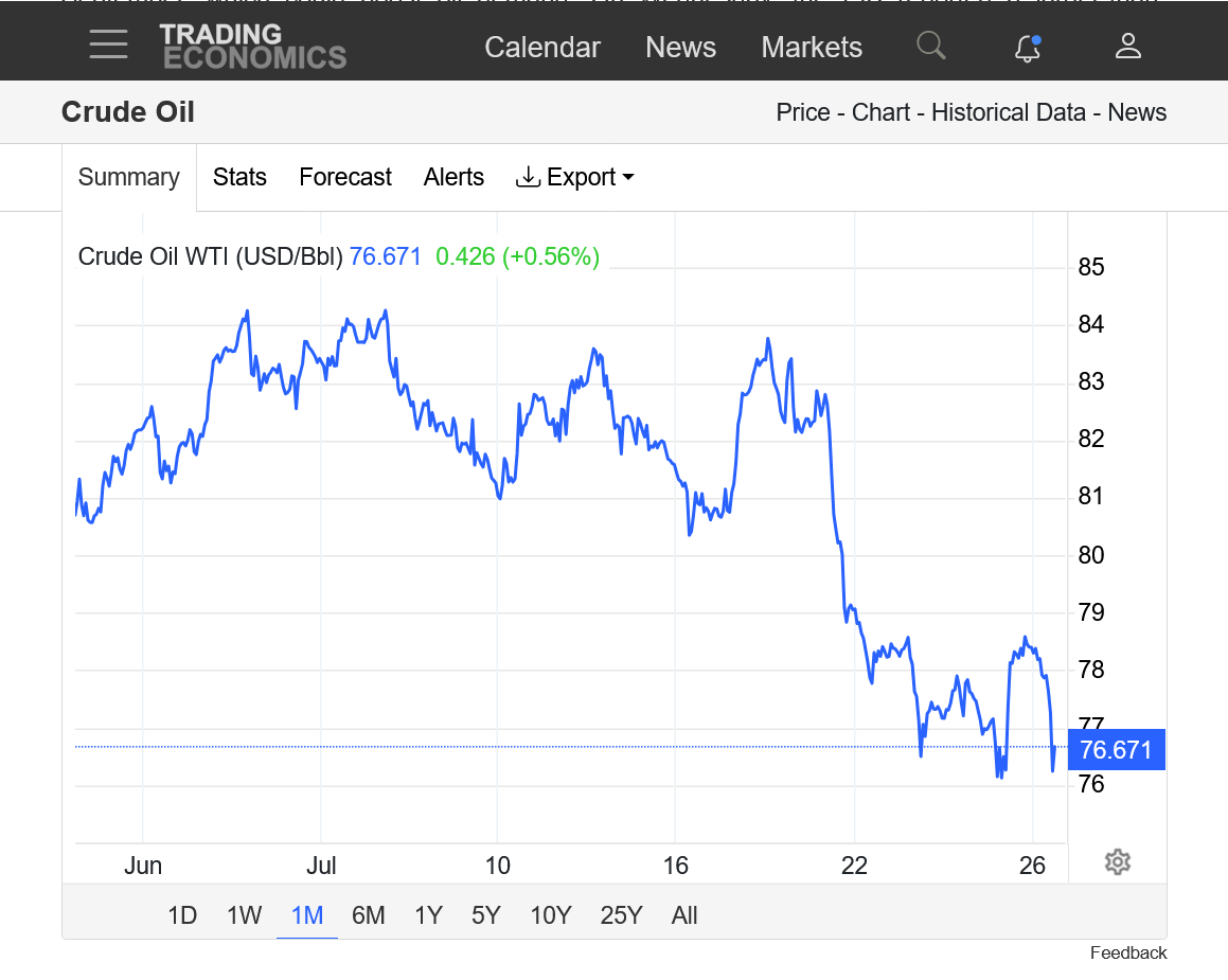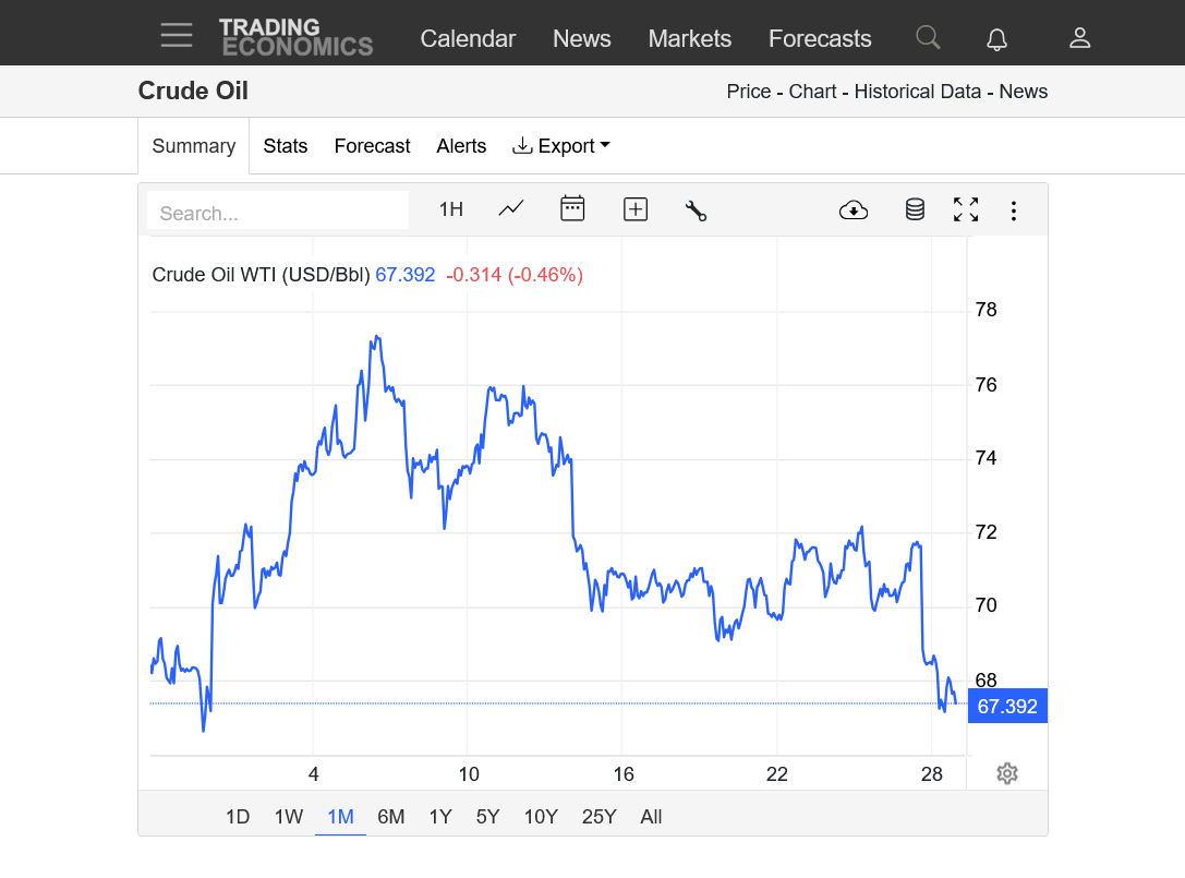 1. 1 week-between 8am-Noon on Tuesday, Oct. 1st, the price of crude spiked +$5!!! After the Iranian attack. Additional spike to new highs after Bidens comments greenlighting israel to take out Irans oil production. Held on a couple of tests of $70 support this week.