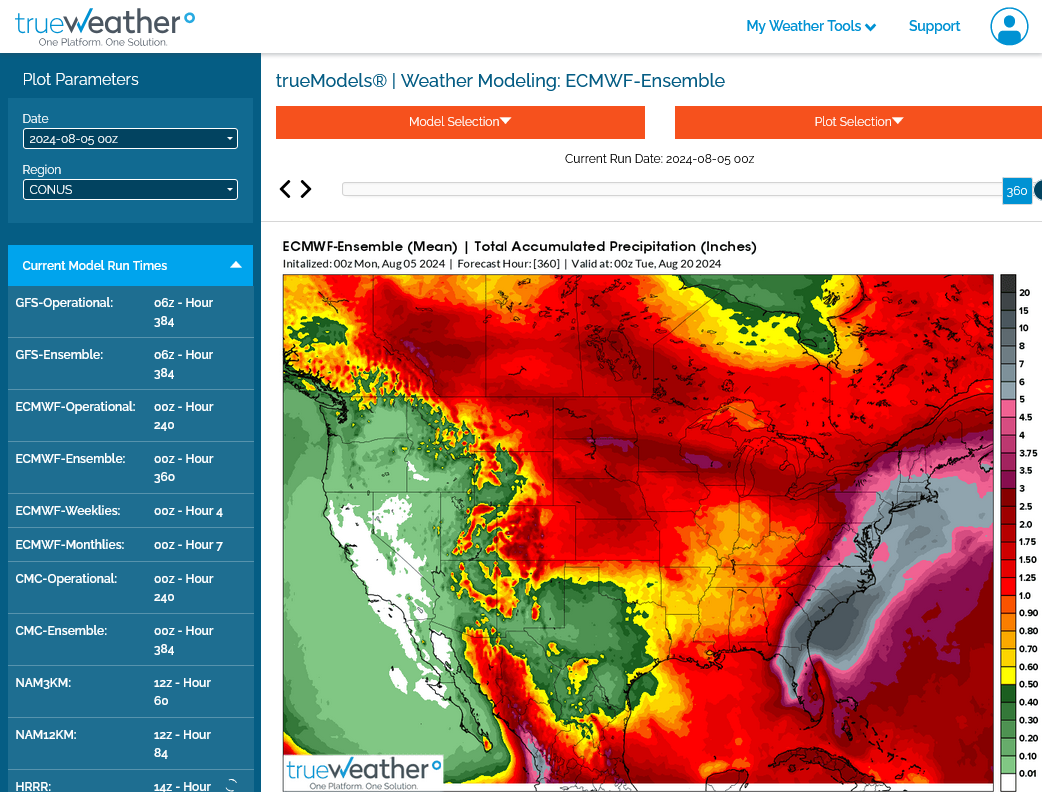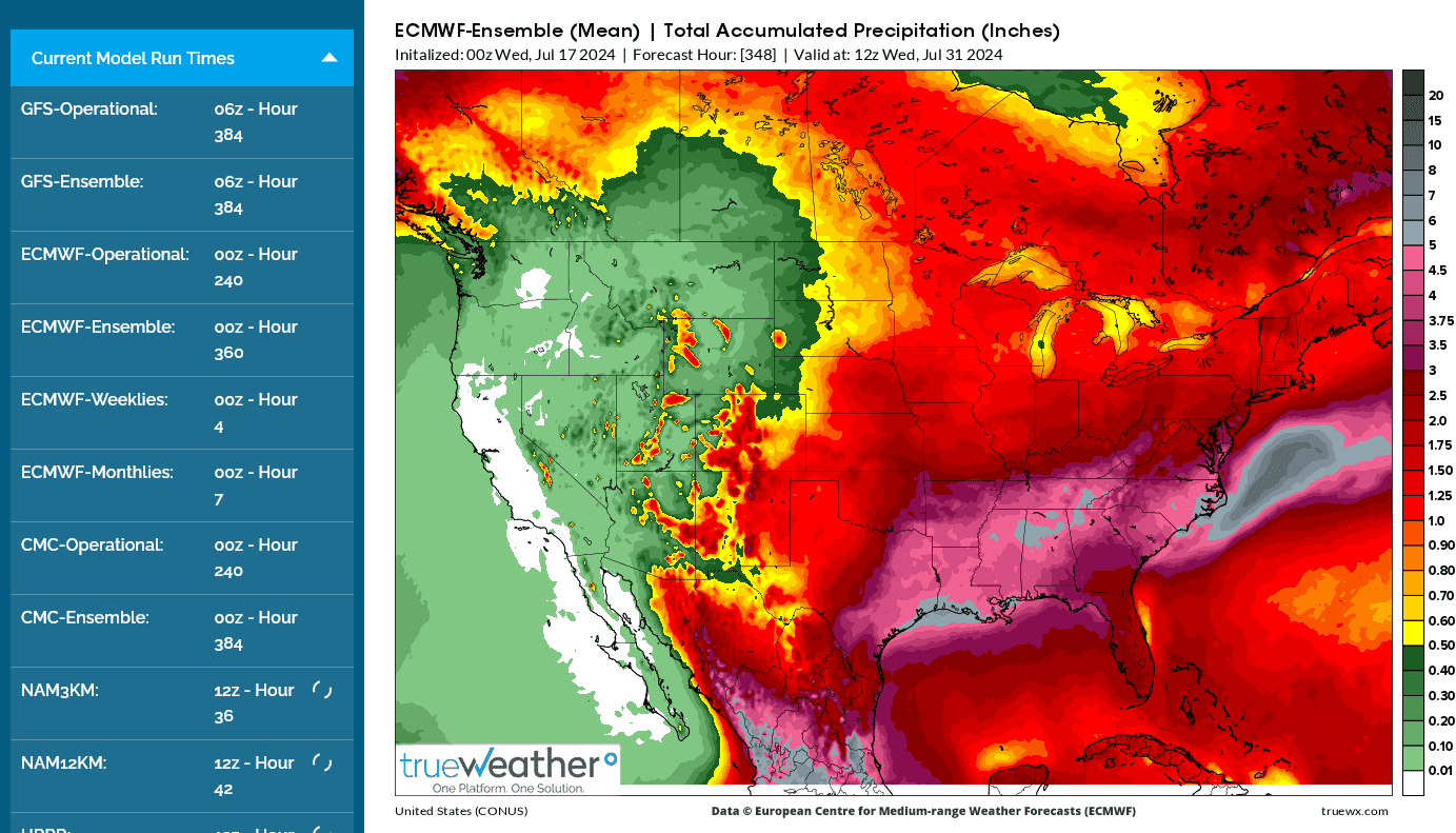 The 2 week rain totals from the last 6z GEFS tell us why beans are -25c this last Monday in July.