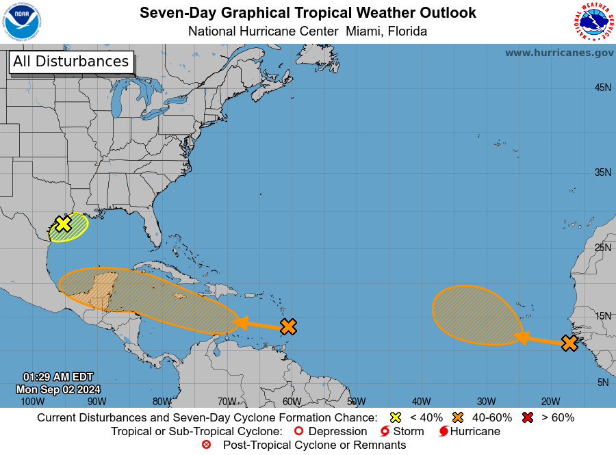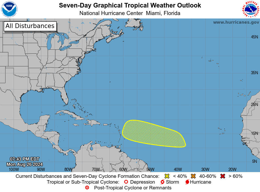 Tropical Weather Outlook NWS National Hurricane Center Miami FL 200 PM EDT Mon Aug 26 2024 For the North Atlantic...Caribbean Sea and the Gulf of Mexico: Tropical cyclone formation is not expected during the next 7 days. $$ Forecaster Hagen/Pasch