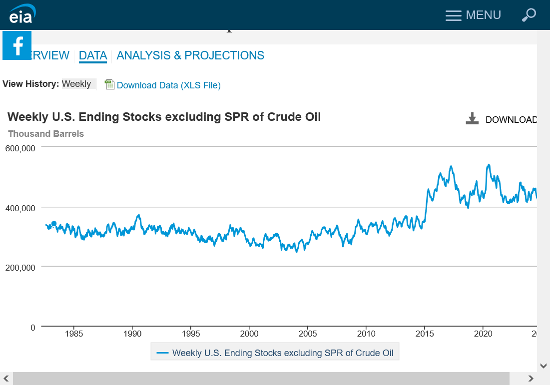 The current level of TOTAL crude stocks is the lowest since February, 1986 during Reagan's filling up of the SPR during his 2 terms as president.........building our crude oil energy security.....to be frittered away for political reasons by Biden/HARRIS..........who now, insanely are trying to twist and lie about it and pretend they did good WITH FAKE SPR NUMBERS. NOT!!!!