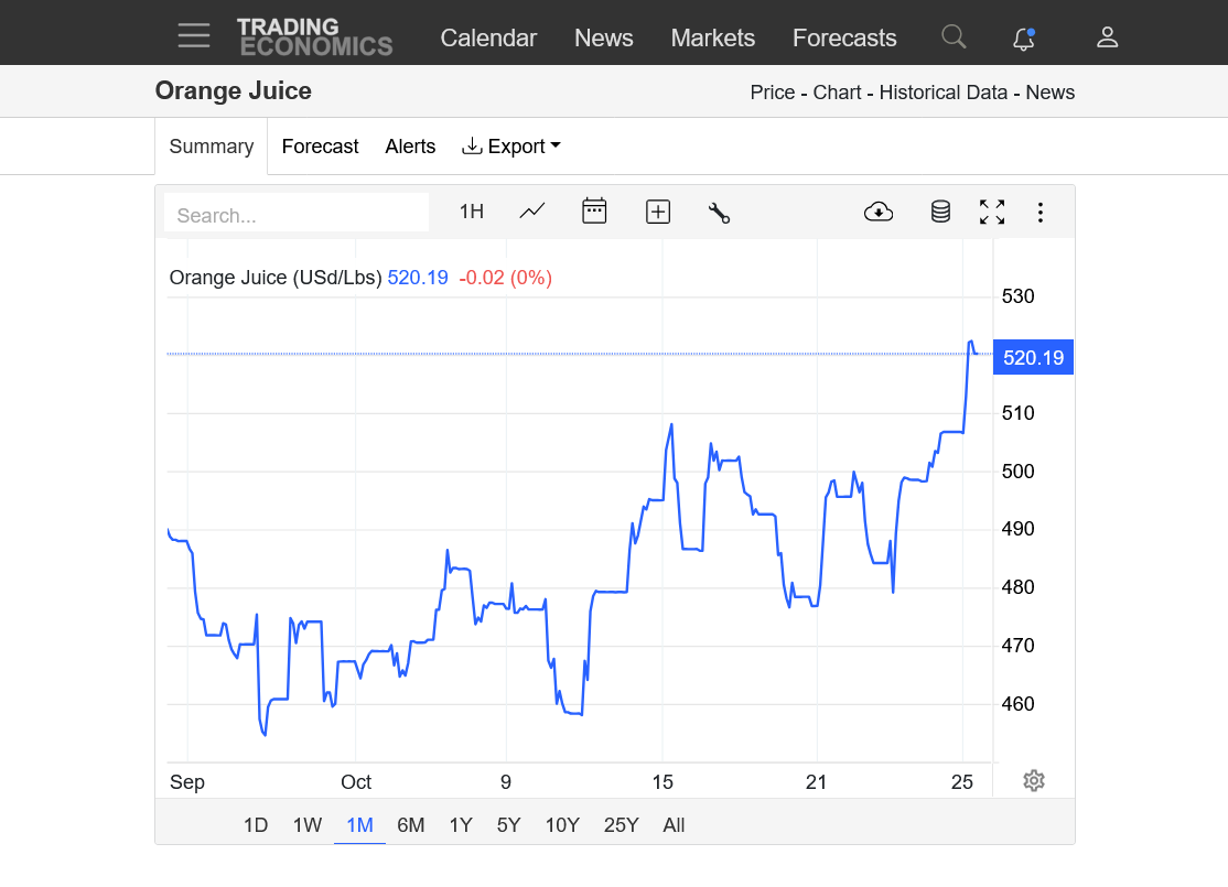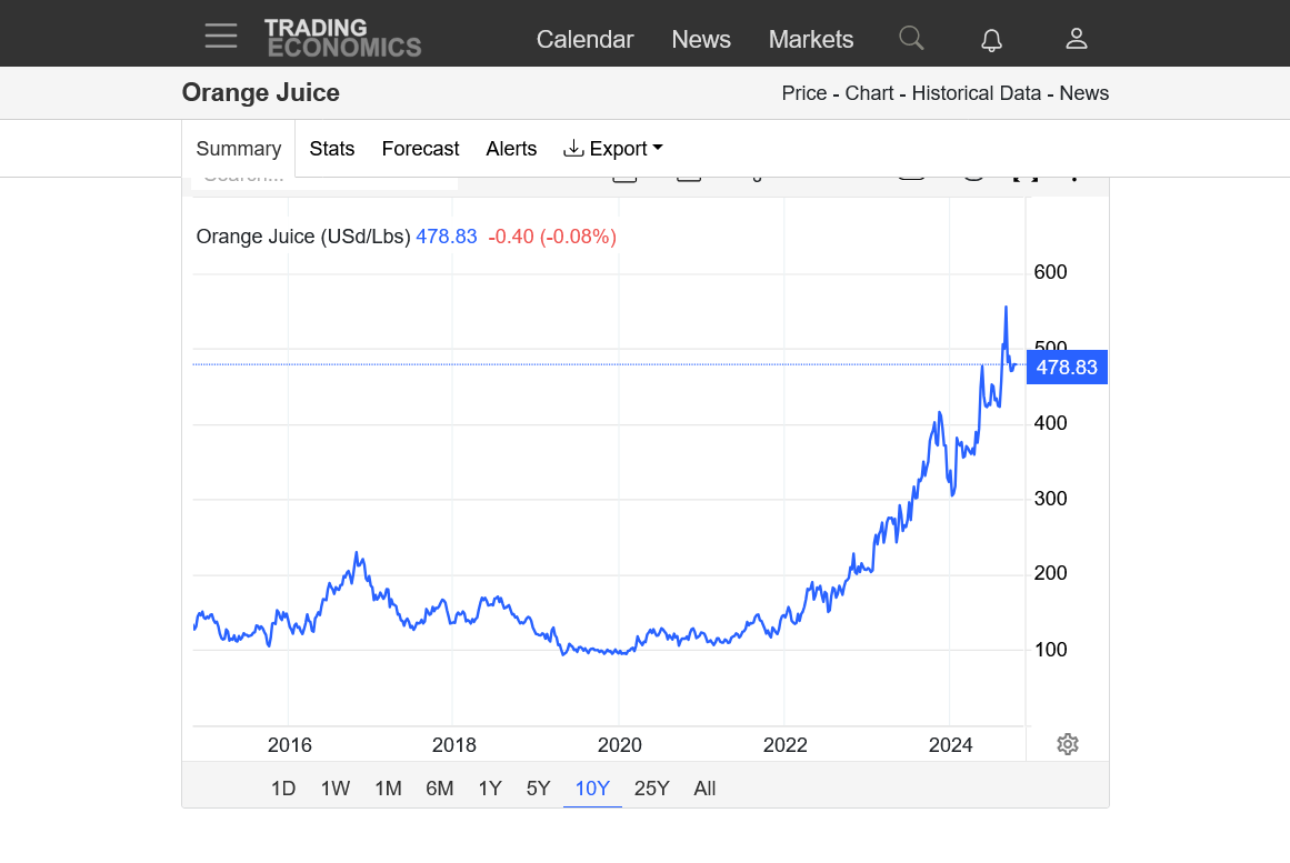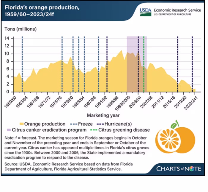 Milton damage probably has something to,do with it but FL production is small in 2024 compared to almost 10 times more 2 decades ago before citrus greening obliterated the orange groves.
