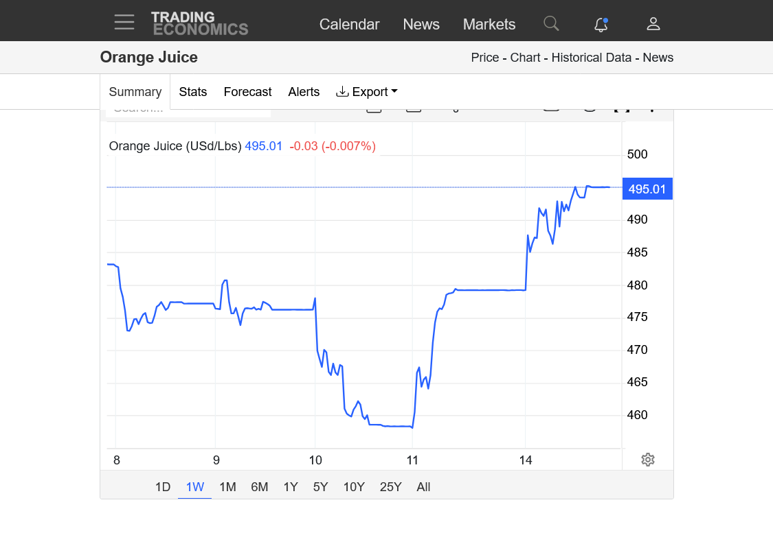 sao paolo in Brazil produces 10 times as much OJ as us….but they’re having citrus greening issues are reducing their production, so supplies are historically tight….note the highest picea in history this year.
