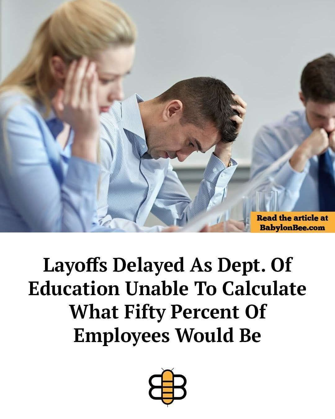WASHINGTON, DC — Layoffs at the Department of Education were delayed yesterday after administrators could not calculate how many employees fifty percent would be.