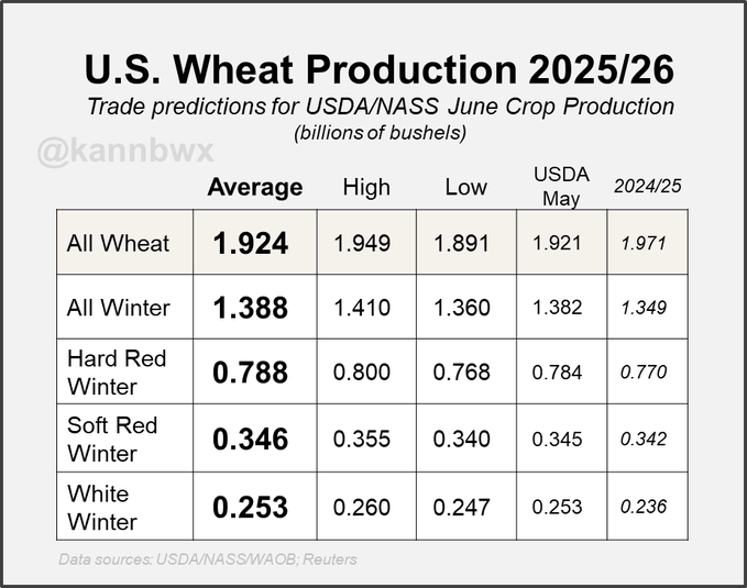 Virtually no change on 2025/26 US #wheat production this month, which is still largely driven by the winter wheat estimates. NASS will add its spring and durum wheat forecasts to the mix next month, which could shake things up.