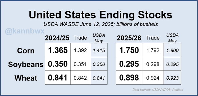 World #wheat stocks fall from last month on higher exports and lower old-crop Russian supply. #Corn stocks are below expectations and last month due to a reduction in old-crop supply. #Soybeans are up from last month on reduced old-crop crush in China.