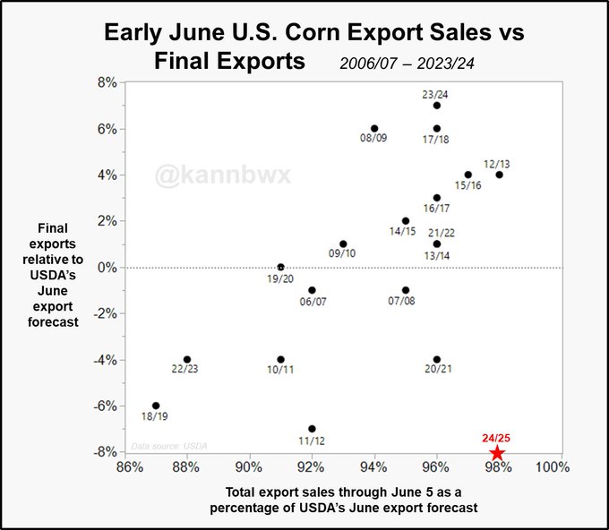 As of June 5, US #corn export sales for 2024/25 covered 98% of USDA's brand-new export target of 2.65 billion bushels. In the last 18 years, there were 8 where coverage by this point exceeded 95%. Seven of those 8 saw bigger final exports than what USDA estimated in June.