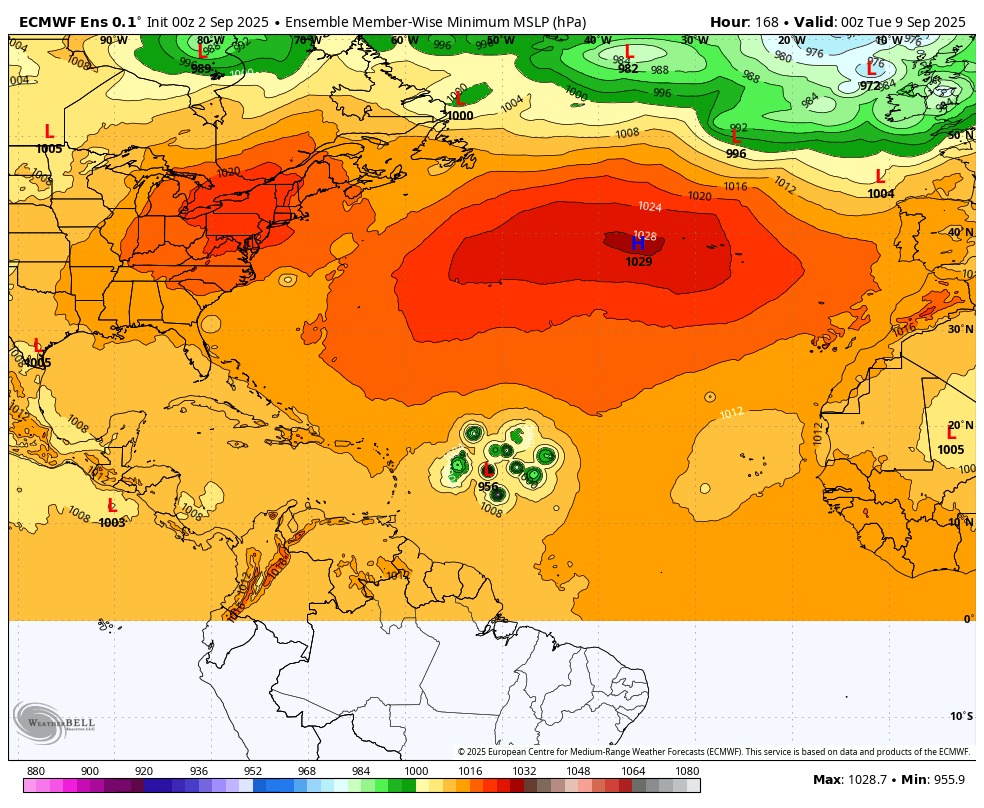 This is what all the solutions from the just out 12z European Ensemble think for Surface Low Pressure in 7 days. It continues to curve northward and miss the United States to the far east: