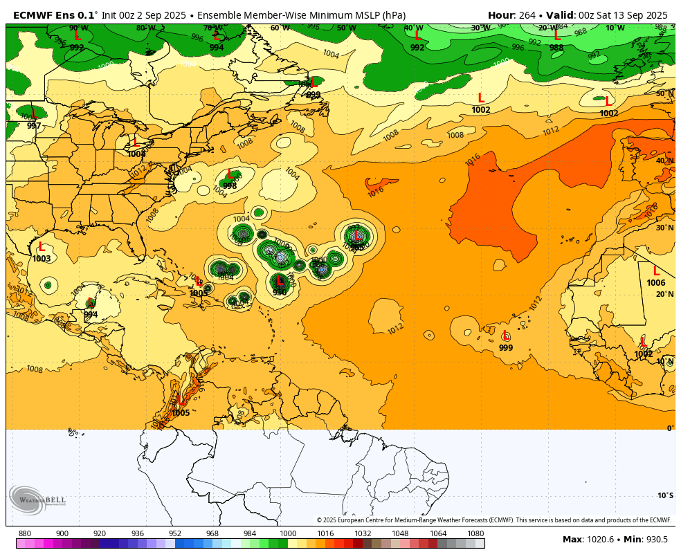 The tropics will be EXPLODING with activity in week 2! These are all the individual solutions for SLP from the Europe Ensemble model. There may be 3 different storms going at the same time.