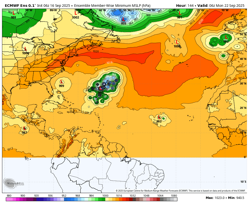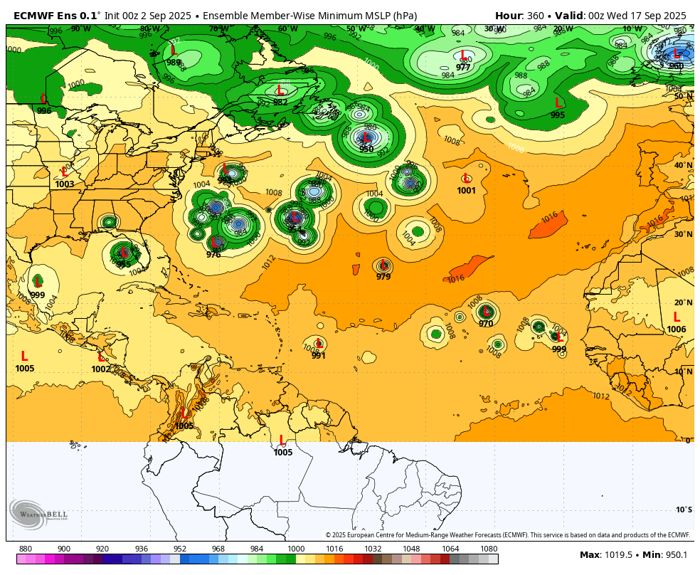This was the Surface Low Pressure forecasts for the different European Ensemble model individual member forecasts from the last 12z run for September 12th, 360 hours/15 days from now.