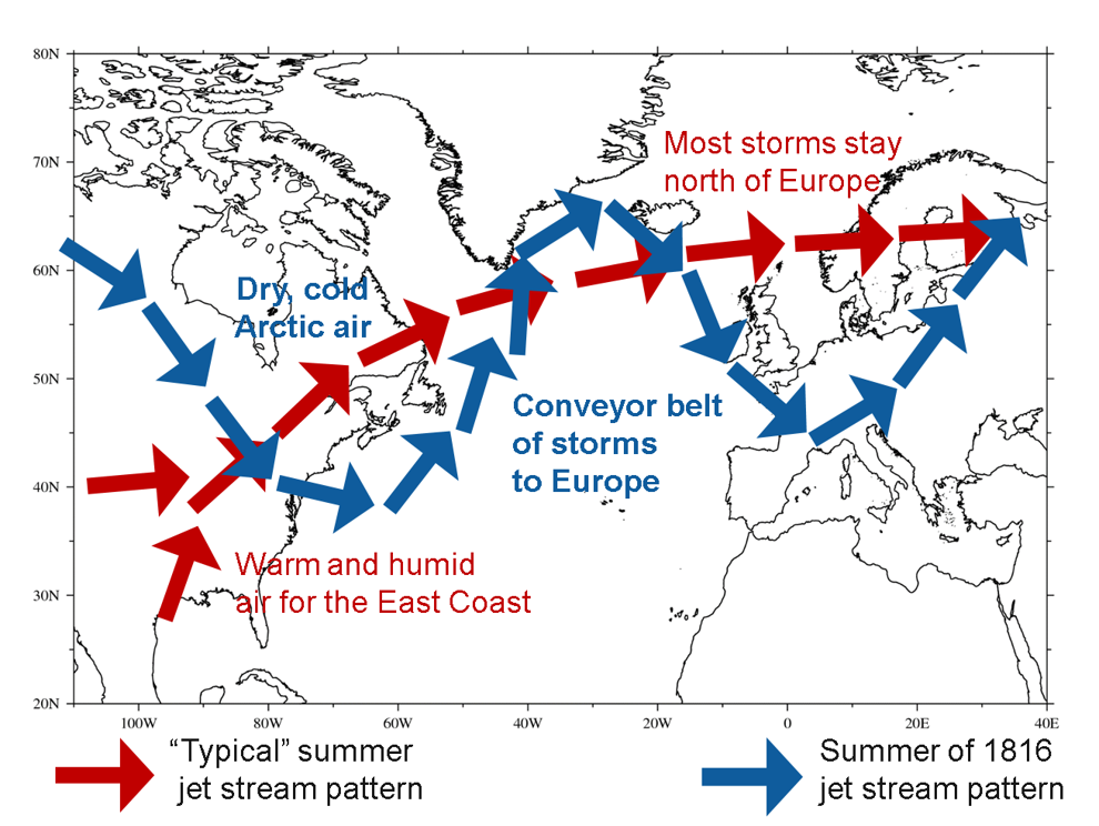 So let's expand more on this, using a depiction of the most amplified version of this pattern, for the Year without a summer, 1816(after an even bigger volcanic eruption cooled the planet).