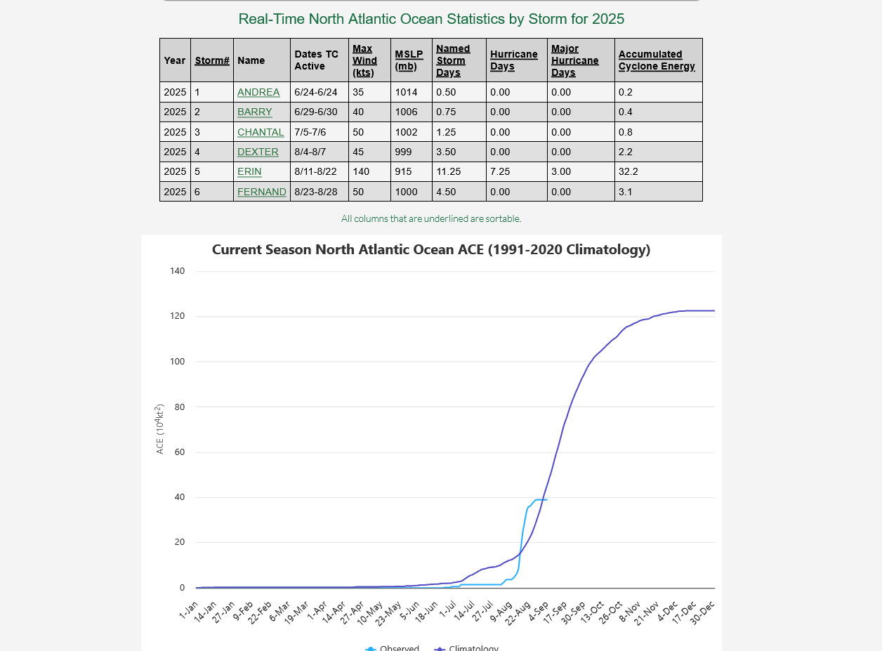 After the huge boost up from Erin last month, ACE in the tropical Atlantic basin has dropped below average again: