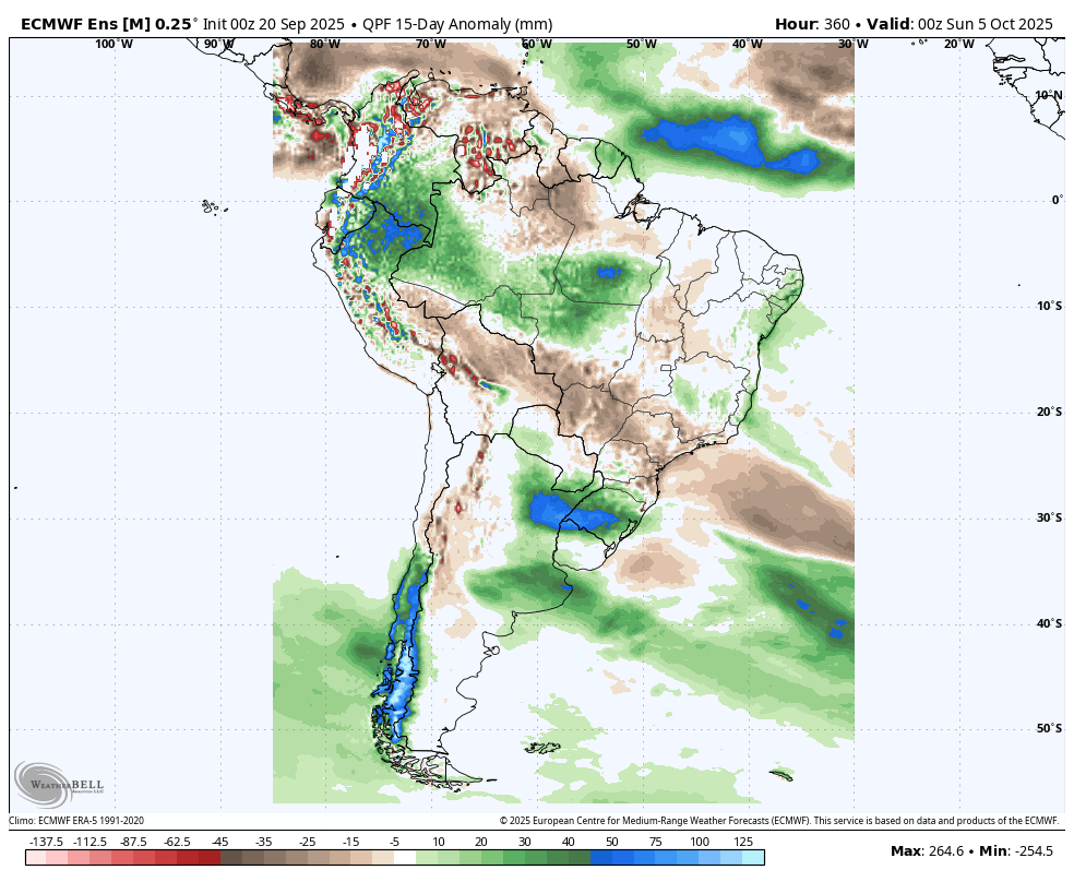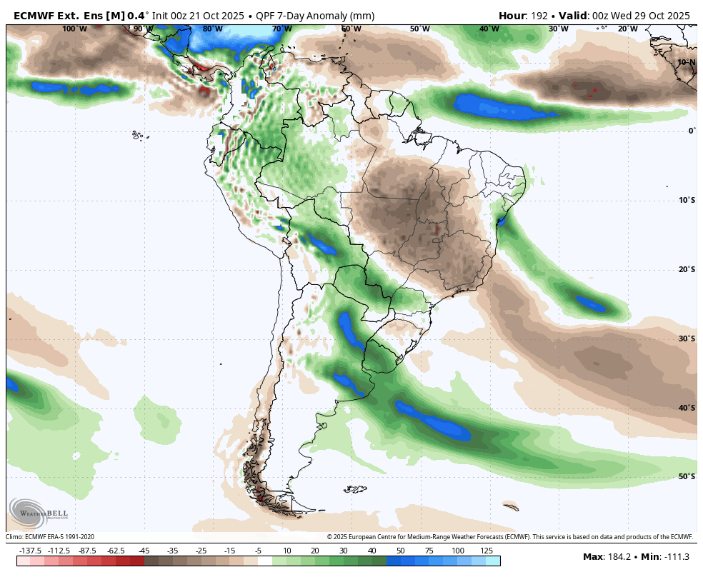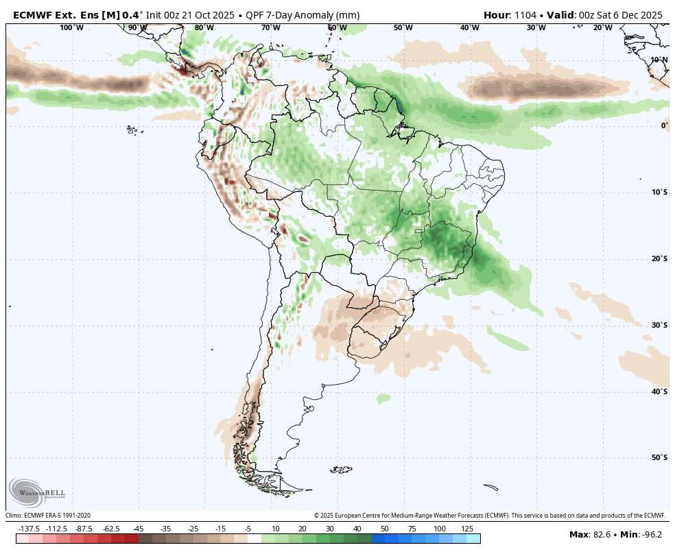2 week rain anomalies in Brazil from the last 12z European Ensemble model. Signs of the first rain at bit early?