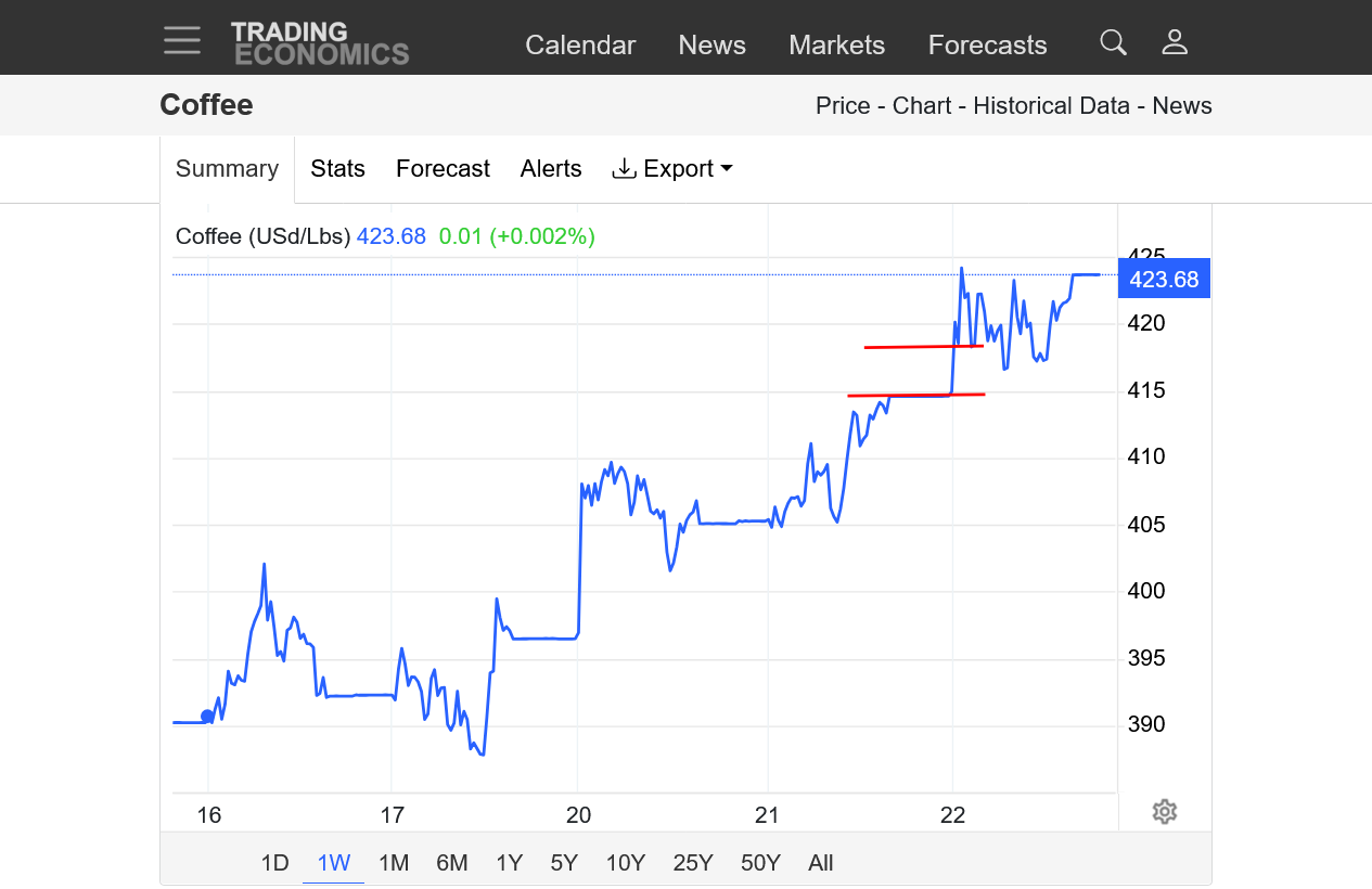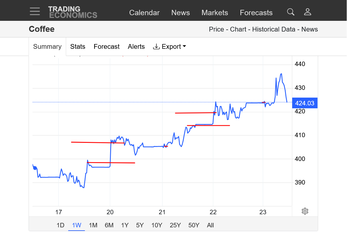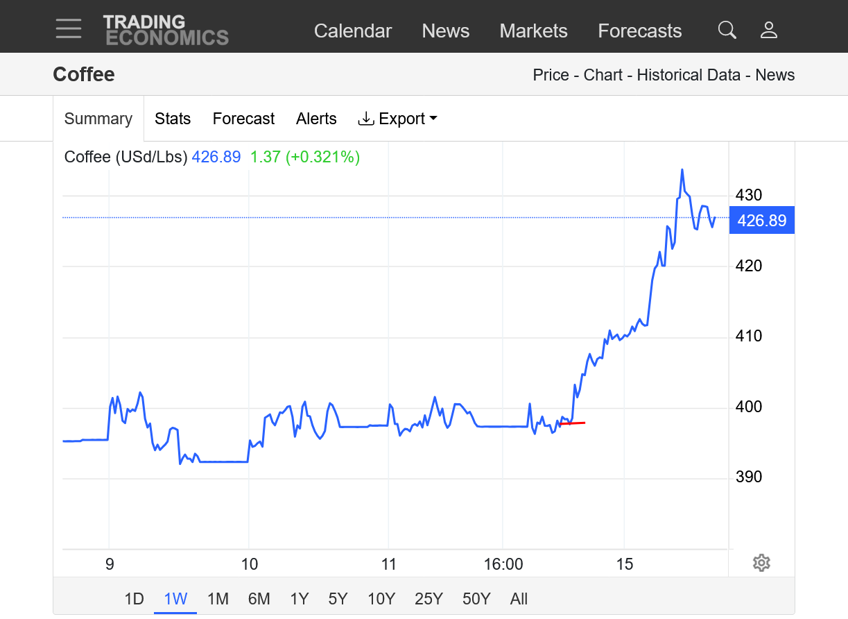 At the link above, I just read their explanation for the price being higher today. It’s the severe drought in Brazil being caused by climate change.