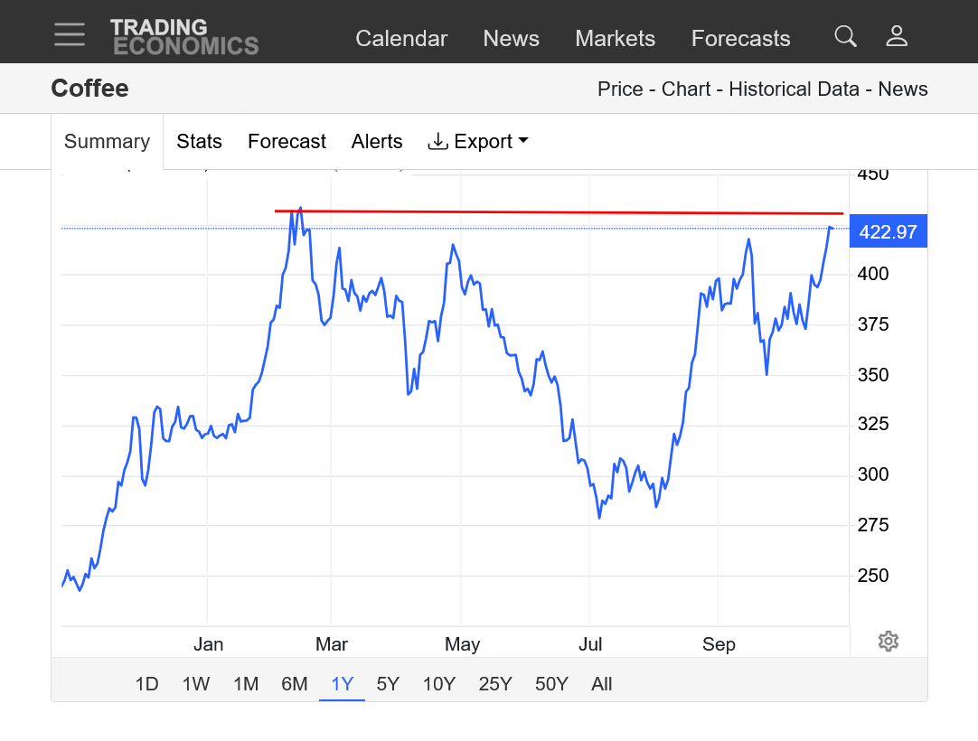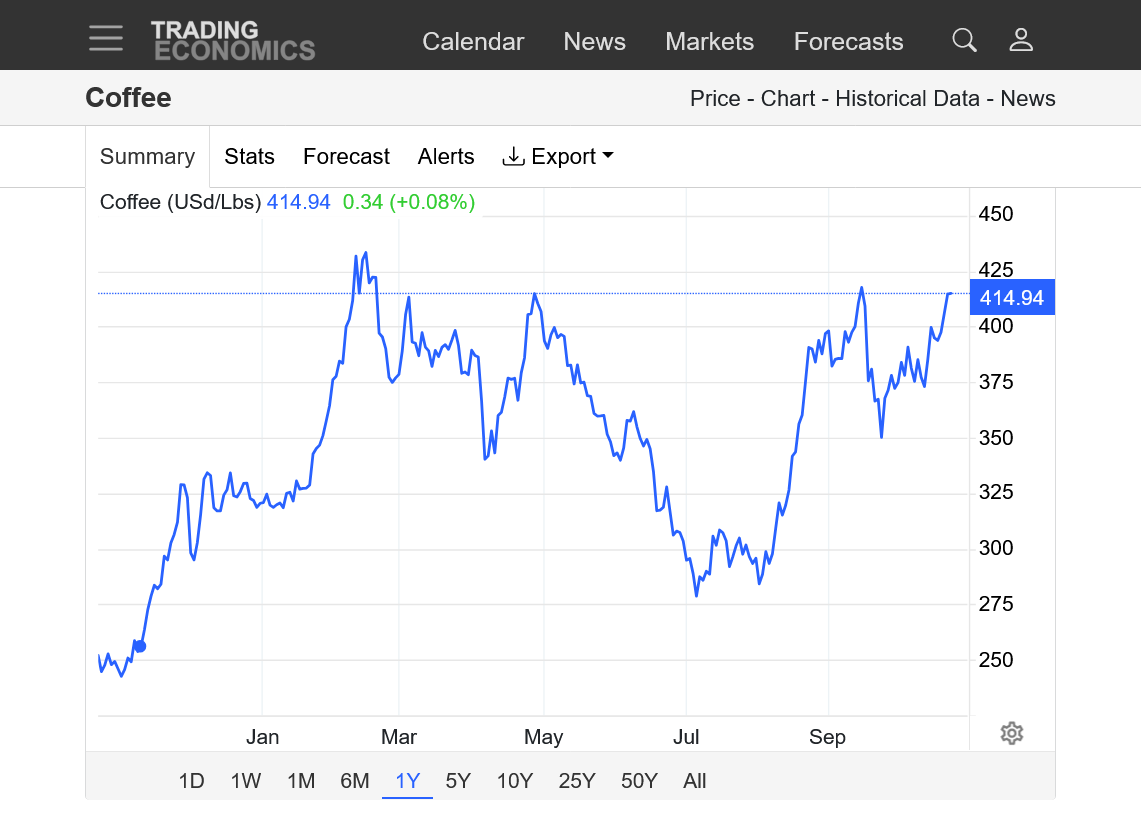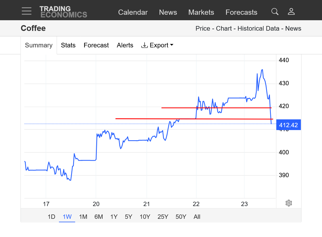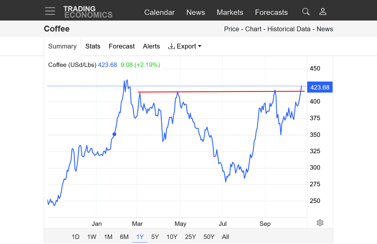 At the link above, I just read their explanation for the price being higher today. It’s the severe drought in Brazil being caused by climate change.