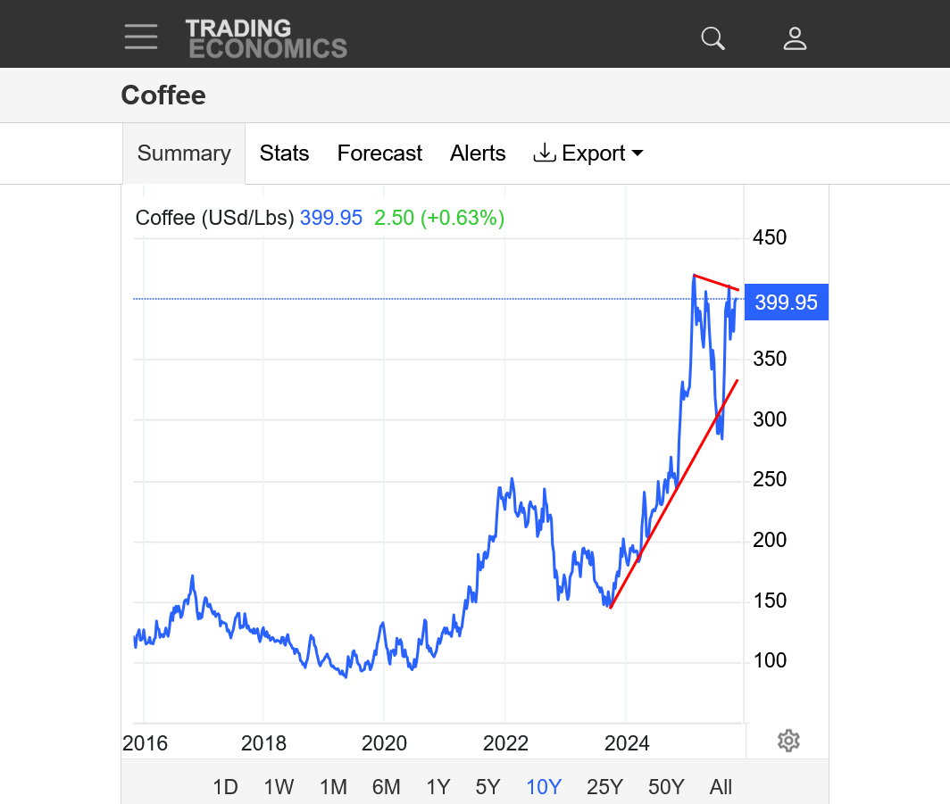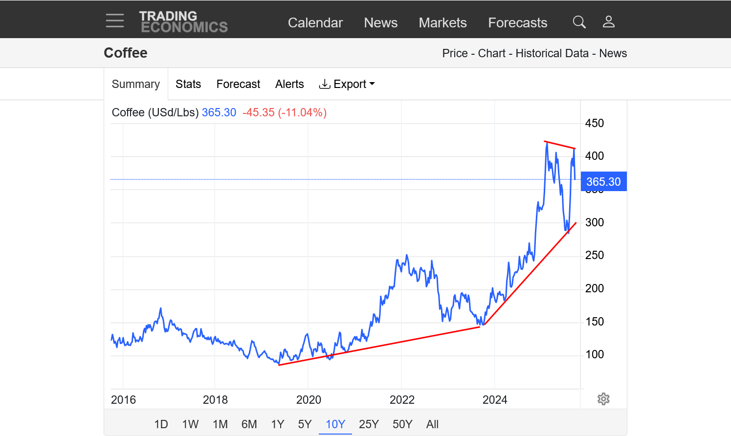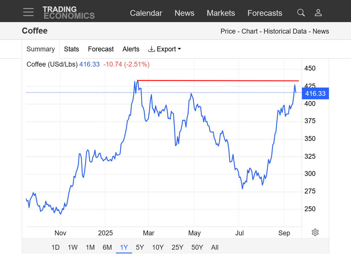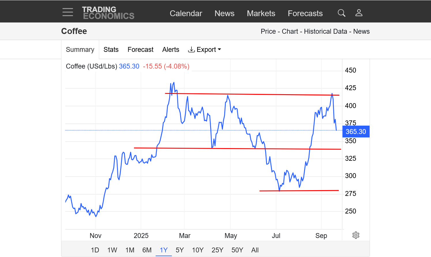 2. 1 year: Top in Feb 2025. Lower high April 2025. Low in July put in after Trump announced a 50% tariff on Brazil coffee. Is this a flag pattern?? Breaking out to the upside above the downtrend? Still well below the highs from earlier this year.