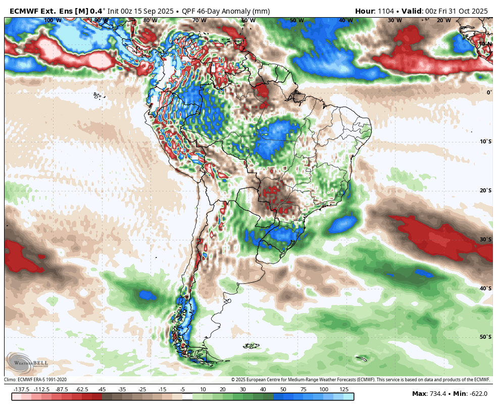 46 day rain anomaly from the last European Ensemble model. Average to slightly above average rain in coffee country.