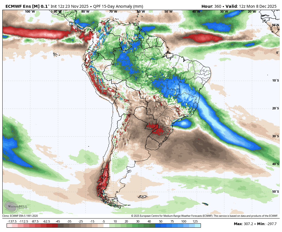 2 week rain anomalies in Brazil from the last 12z European Ensemble model. Signs of the first rain at bit early?