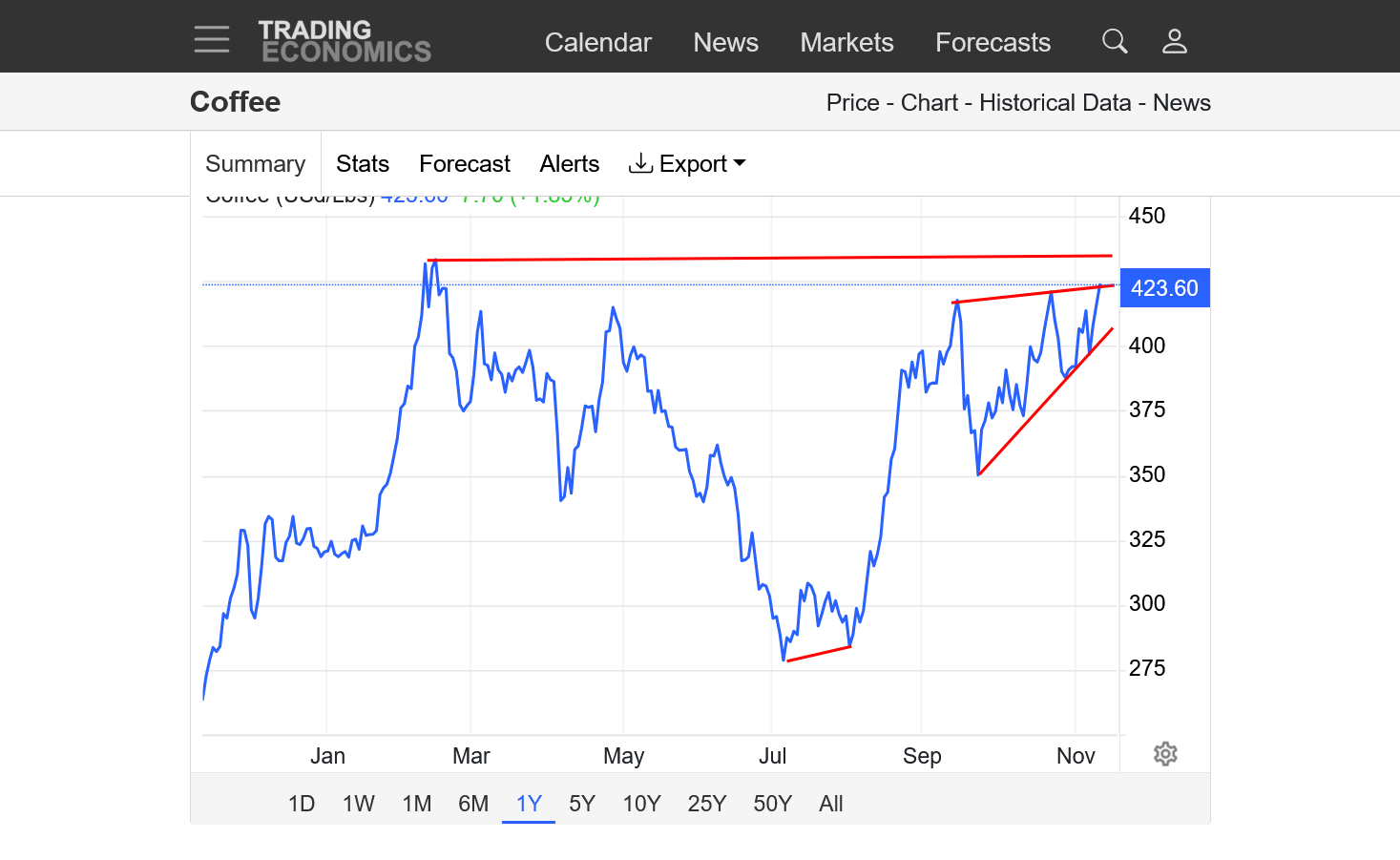 2. 1 year: Coil or tightening wedge formation. Ascending triangle, with distinctly higher lows and close to the same highs. Technically looks pretty bullish and predicts an upside breakout BUT THE WEATHER in key production areas of #1 coffee producer Brazil is bearish.