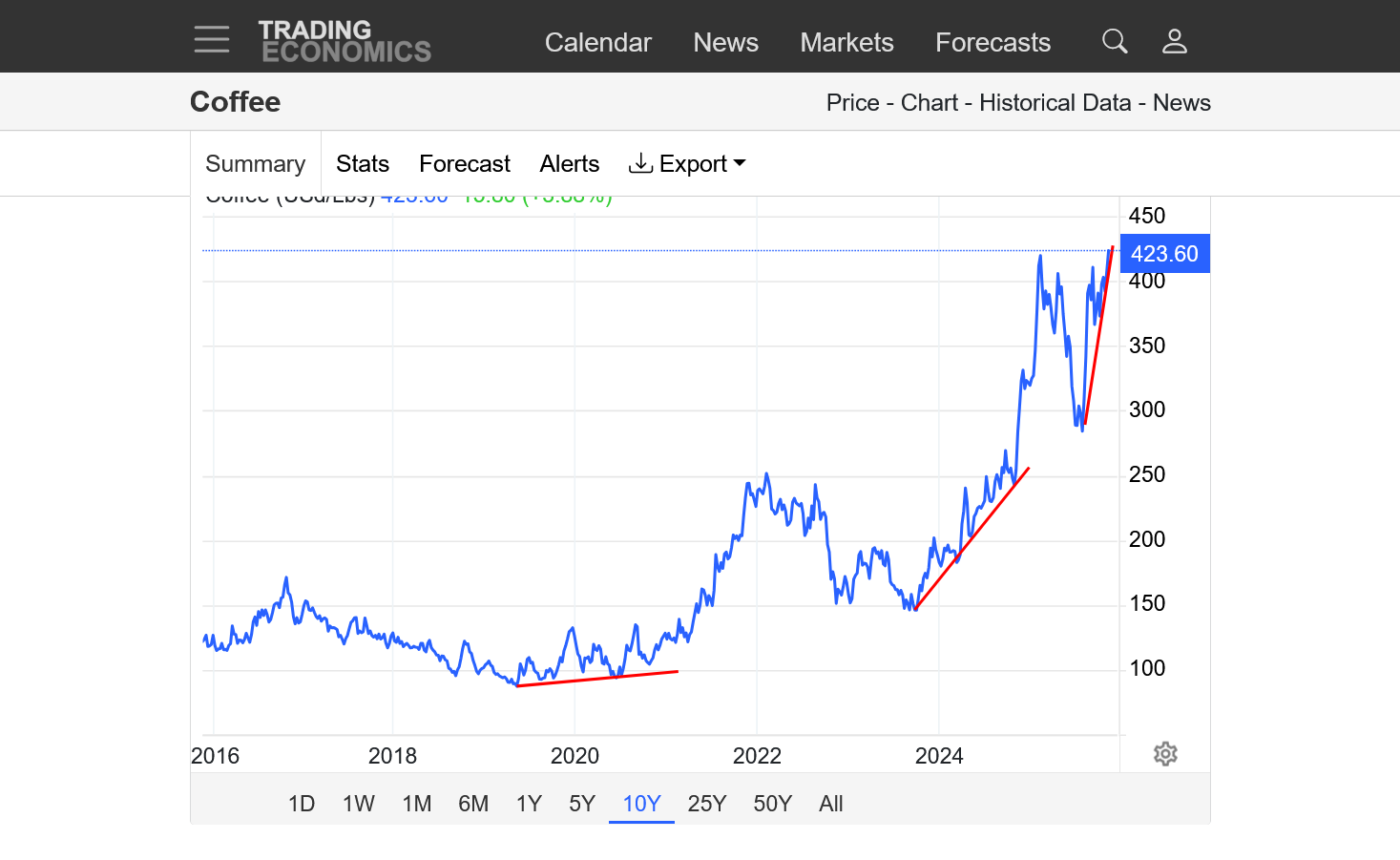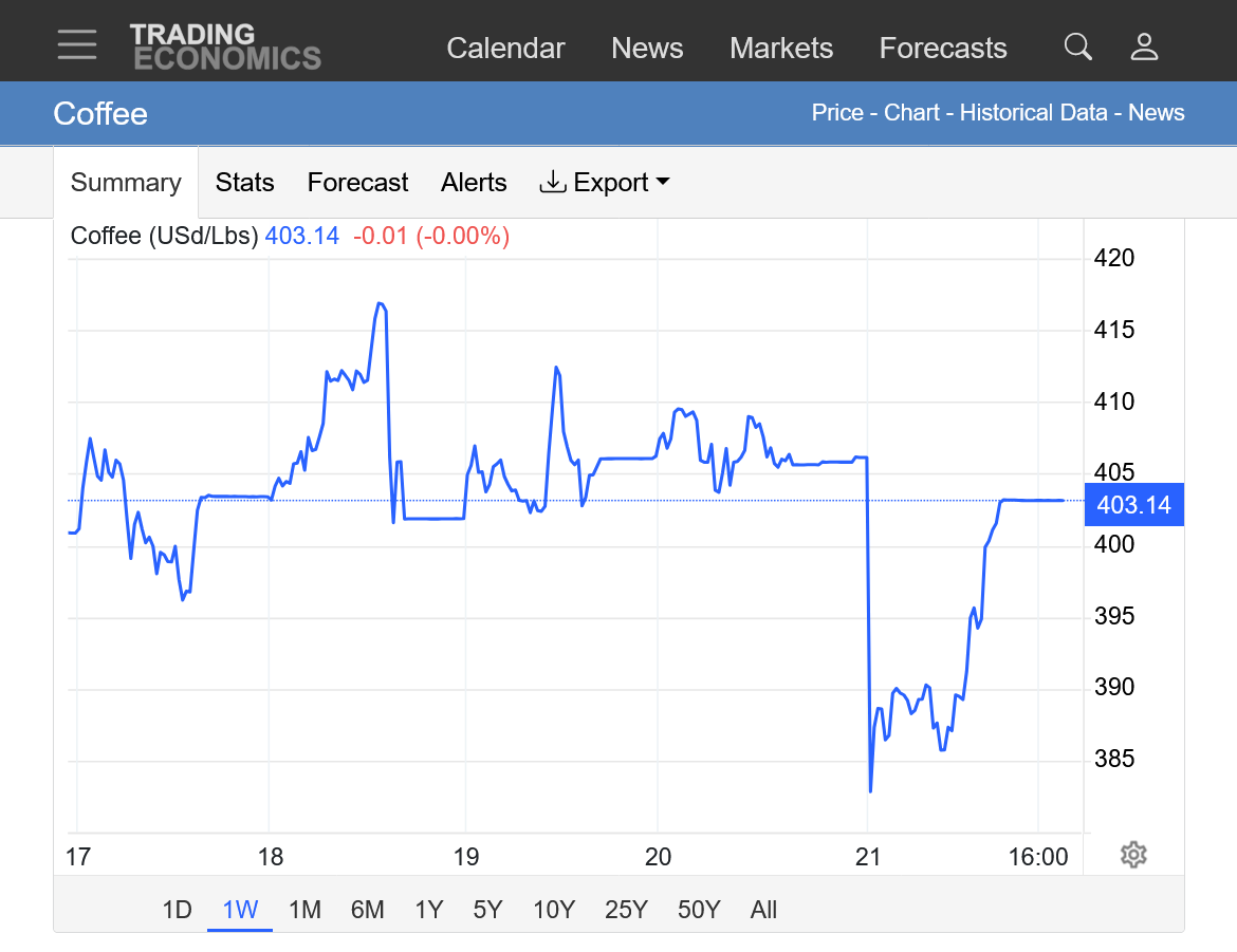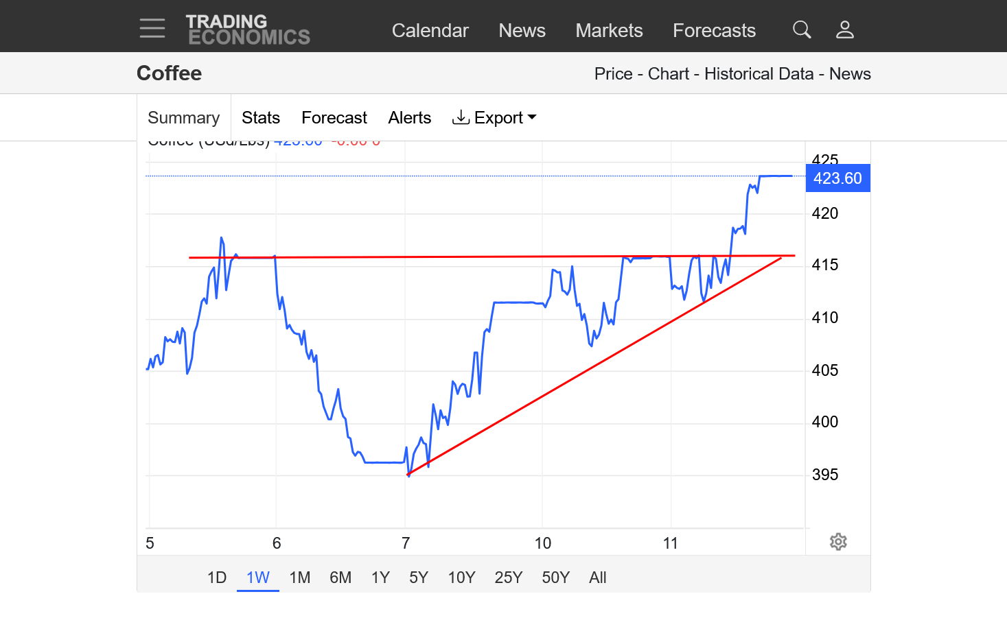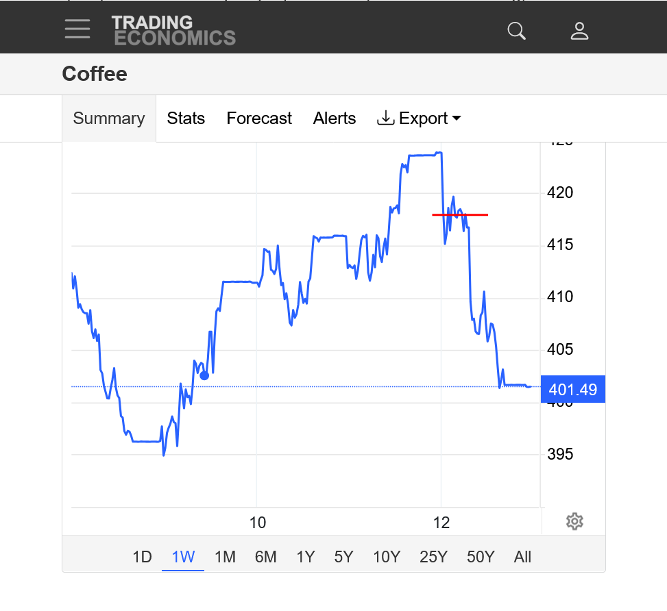 At the link above, I just read their explanation for the price being higher today. It’s the severe drought in Brazil being caused by climate change.