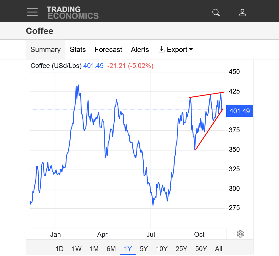 2. 1 year: Top in Feb 2025. Lower high April 2025. Low in July put in after Trump announced a 50% tariff on Brazil coffee. Is this a flag pattern?? Breaking out to the upside above the downtrend? Still well below the highs from earlier this year.