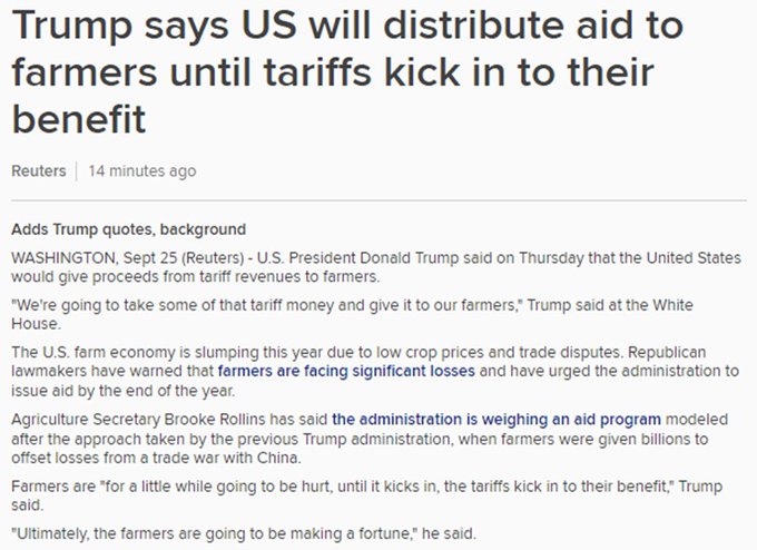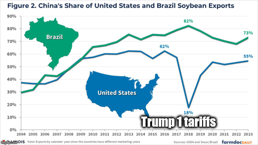 2. Trump's tariffs couldn't have come at a worse time. Soybeans are at least $1 cheaper because China, our #1 buyer has been buying ALL their beans from South America. Costs are going higher from inflation, which has also gotten worse because of Trumps tariffs.
