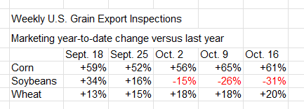 Export inspections for U.S. soybeans last week came in above the range of expectations despite no sales to China. However, they were 42% lighter than the same week last year. Corn inspections remain much stronger than usual for the time of year.