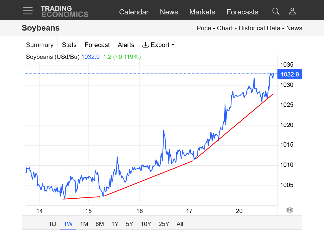 I'm sure you're aware that the price of beans would be $1+ higher if not for Trump's tariffs on China...........which have changed half a dozen times.