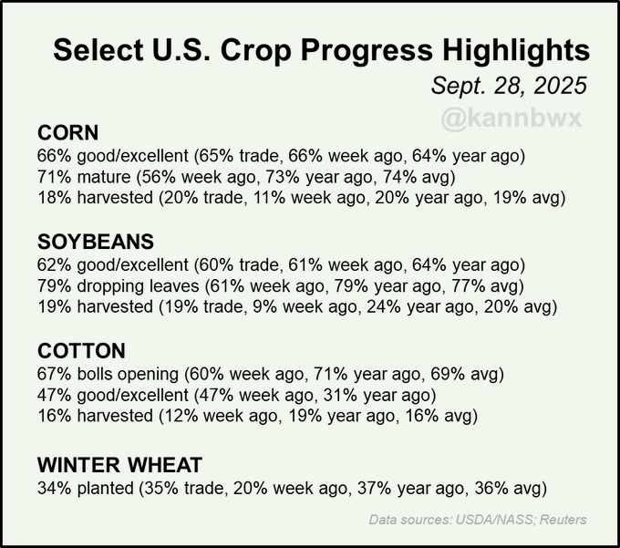 U.S. corn and soybean harvest is in the early stages and moving a hair slower than a year ago. Spring wheat harvest is just about finished, but winter wheat planting is going slower than expected.