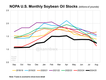 NOPA U.S. crush, August 2025:189.810 mln bu of soybeansAbove all trade guesses (avg was 182.86 mln)p 20% on the year, 13% above prior Aug record (2019)Soyoil stocks 1.245 bln lbsBelow avg trade guess of 1.298 blnUp 9.4% on the year