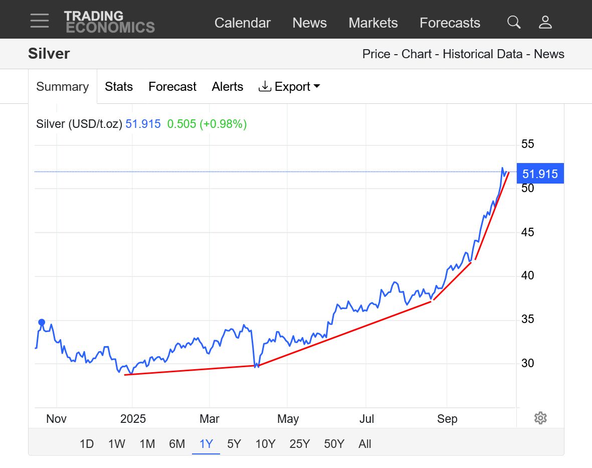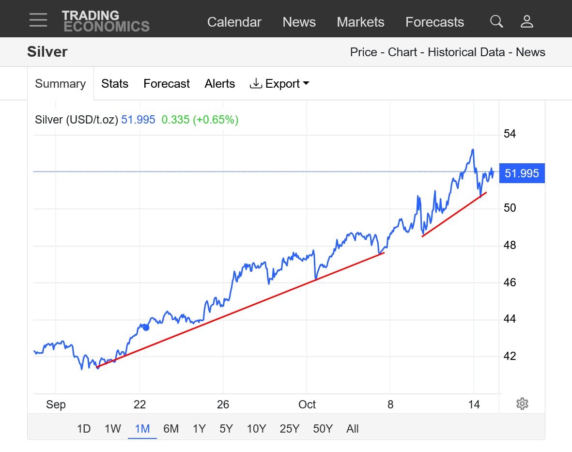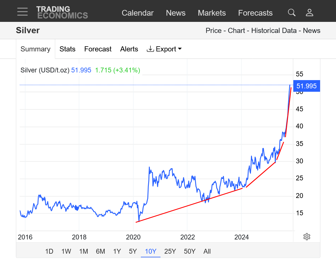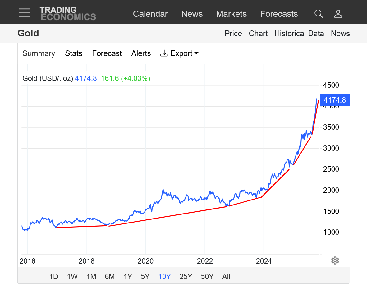 3. 10 years: Parabolic/exponential move up, like silver, just not as strong this year as silver. Increasingly steeper and steeper slope to the upchannel. It can't continue forever but its almost impossible to know when it will end. Still below all time highs last month.