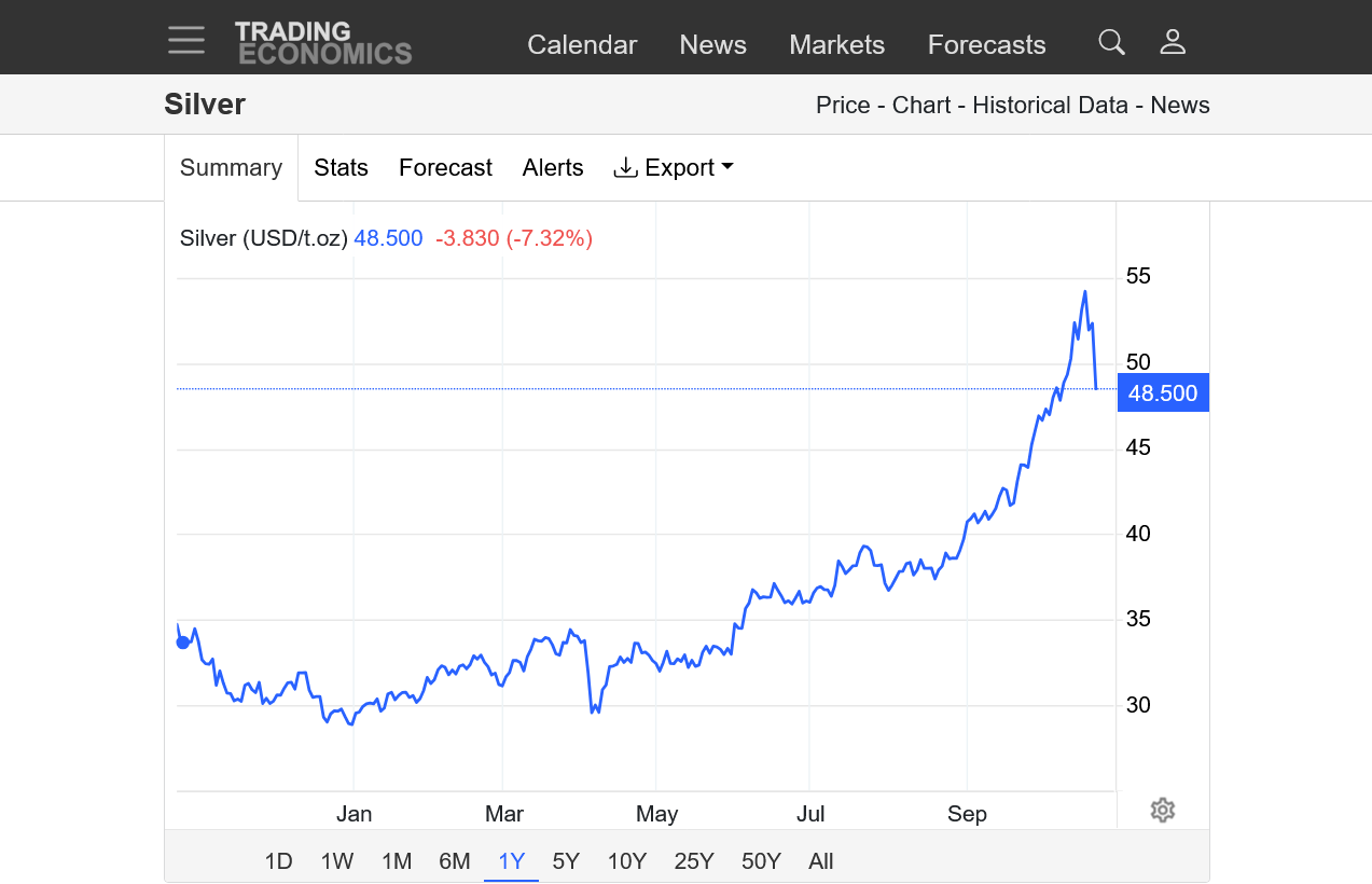 Back in the late 70s silver was a necessary metal for developing film. As you may recall silver rallied from $5/oz to $50/oz in the Hunt brothers bull market also fueled by pretty severe inflation. The story I recall was a film developer looked at his silver inventory and discovered that it was worth 3 times the value of his business. He unloaded at the top, not because he thought "this is the top". He sold because people were offering him "stupid valuations".