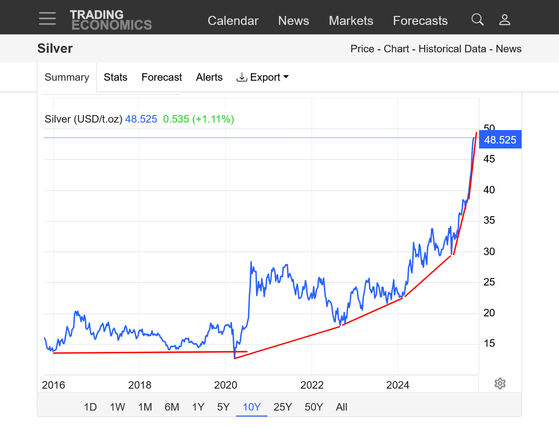 Incredible parabolic/exponential move up! Steepening uptrend slope. 3-4 times higher price compared to a decade ago.