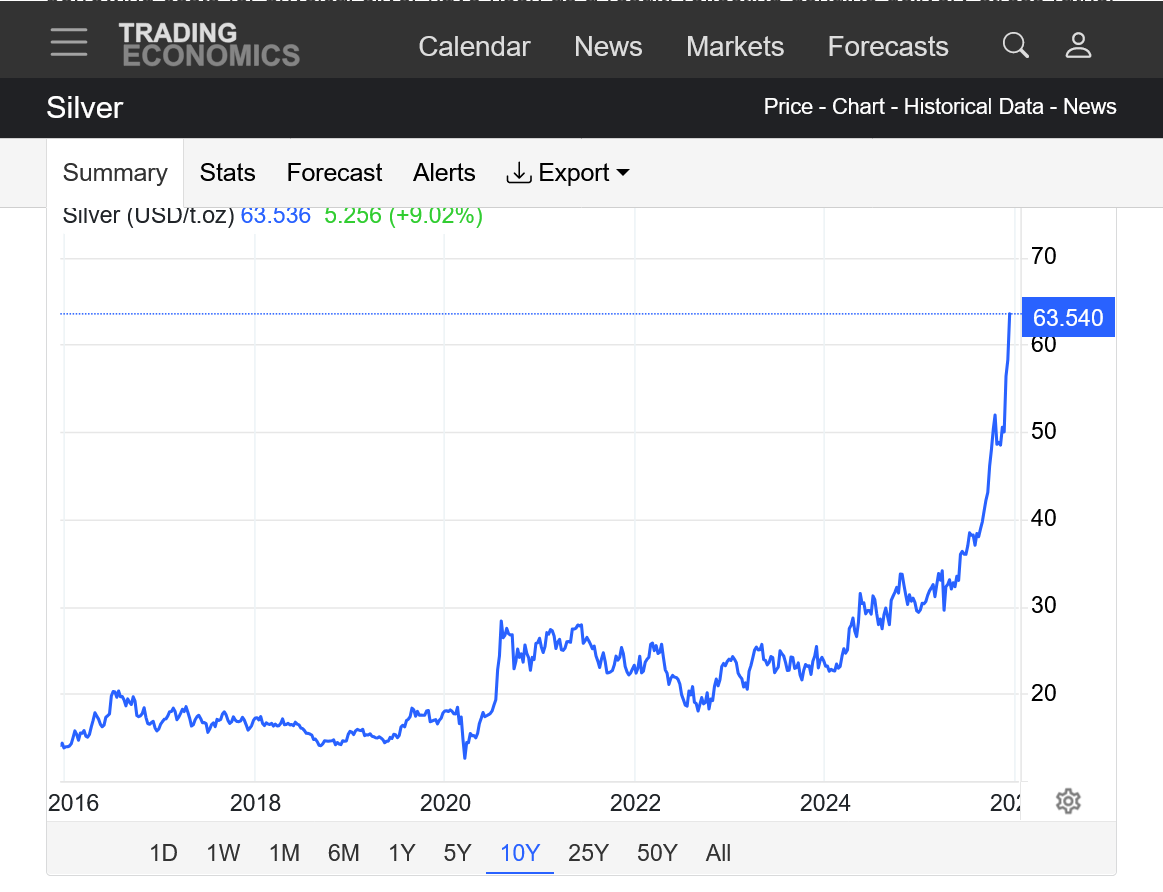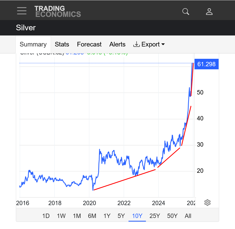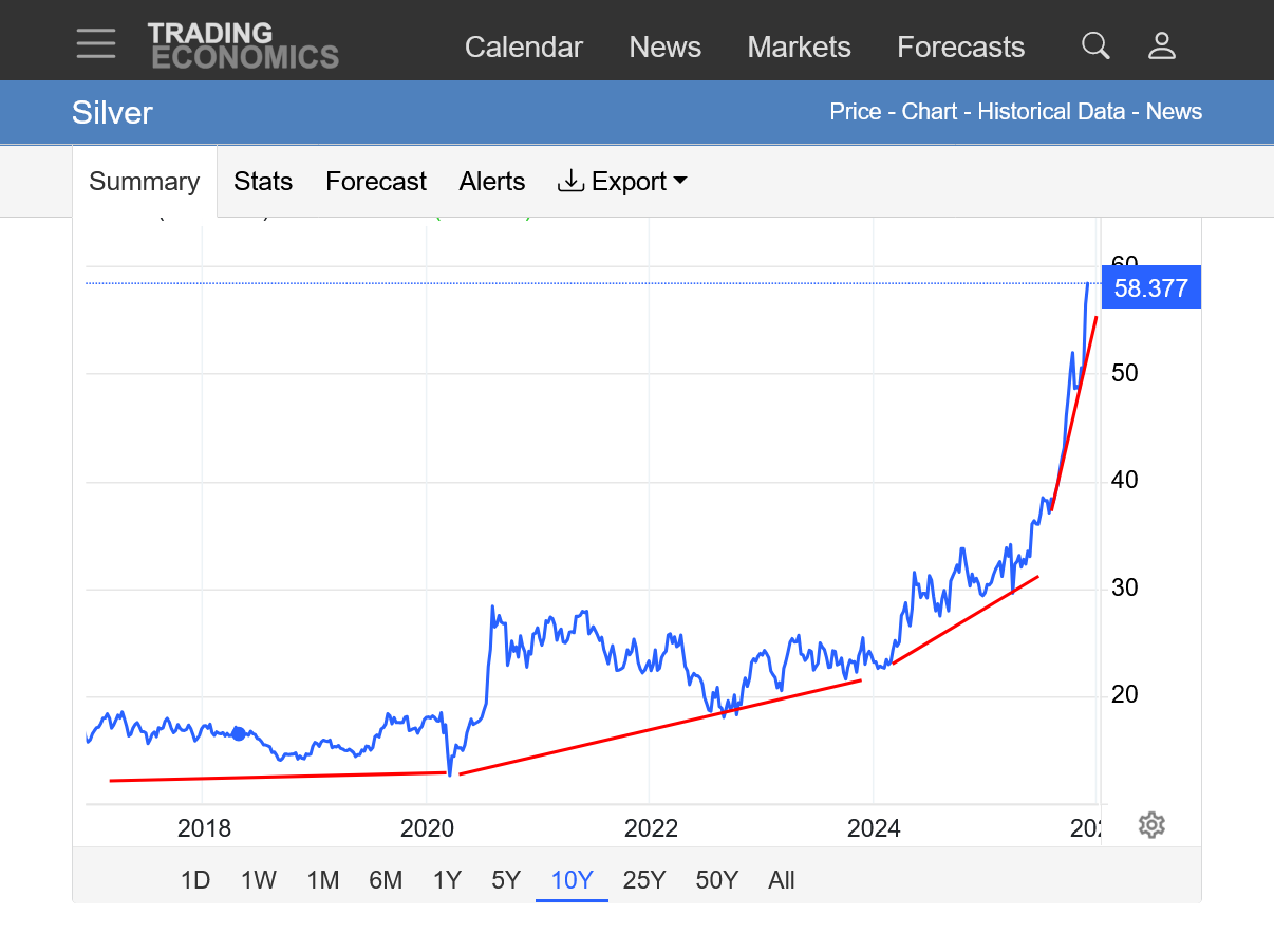 3. 10 years: Parabolic/exponential move up, like silver, just not as strong this year as silver. Increasingly steeper and steeper slope to the upchannel. It can't continue forever but its almost impossible to know when it will end. Still below all time highs last month.