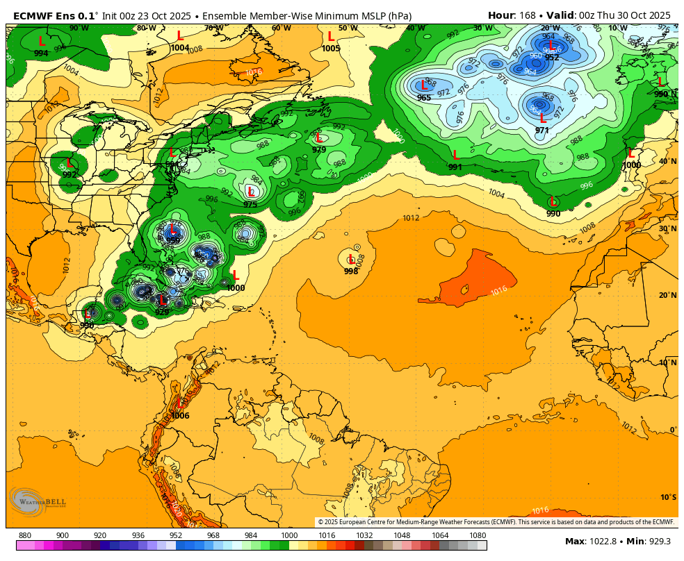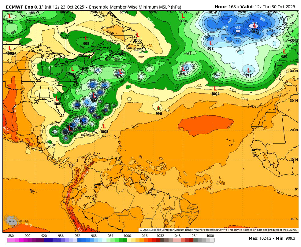 This is the day 10 forecast of the surface low pressure solution for the individual members of the last 0z European Ensemble solution.