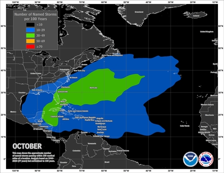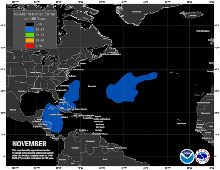 This warm water is still there in November which is why most of the Atlantic Basin hurricanes come from this region.