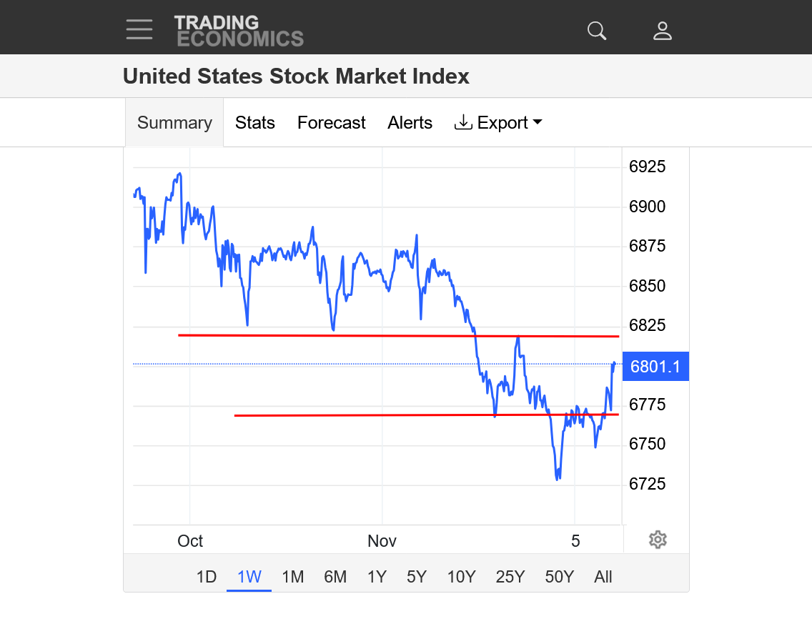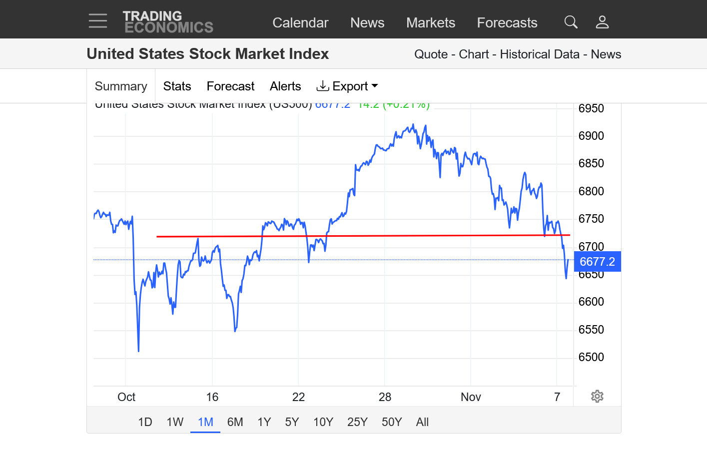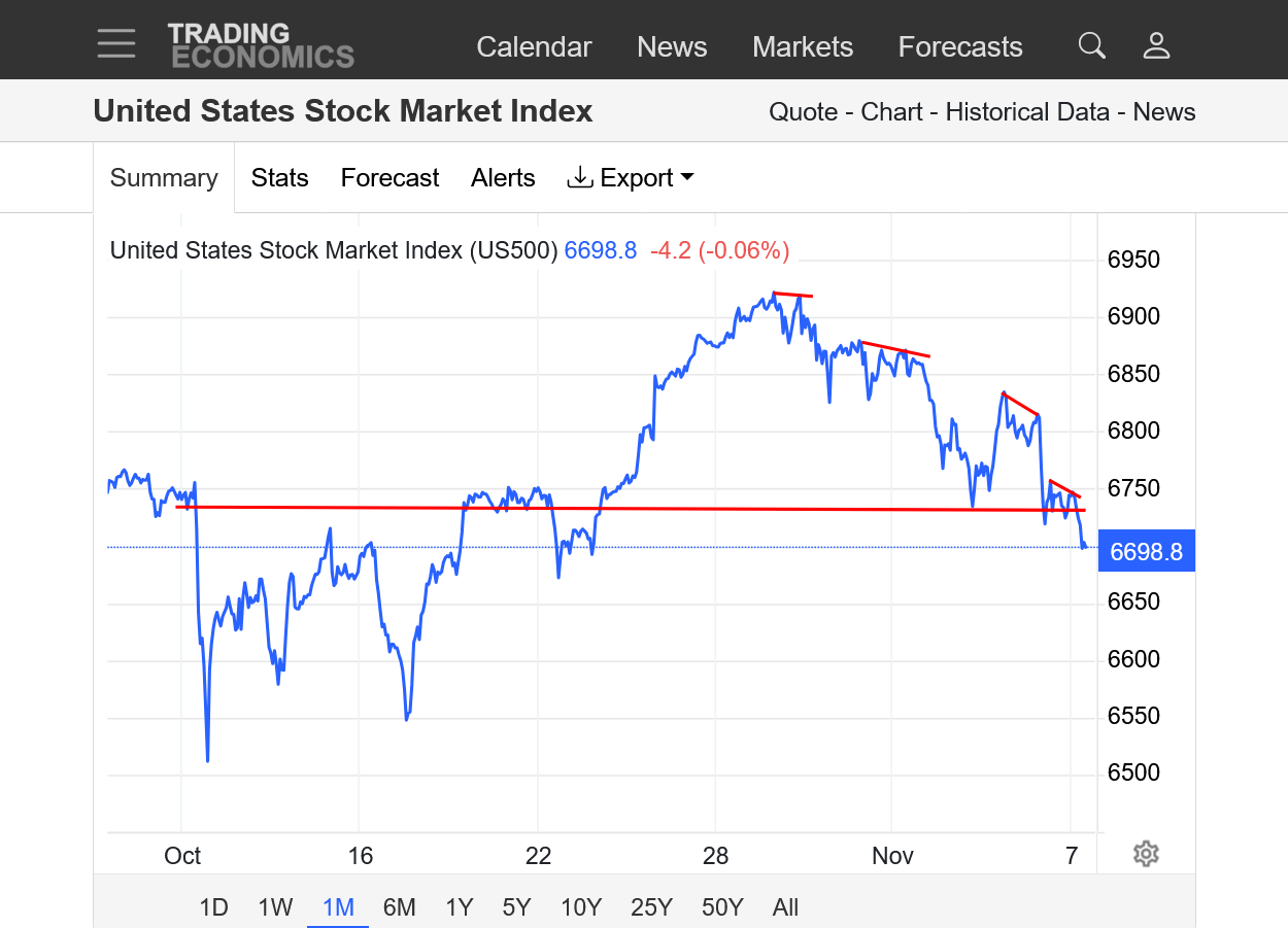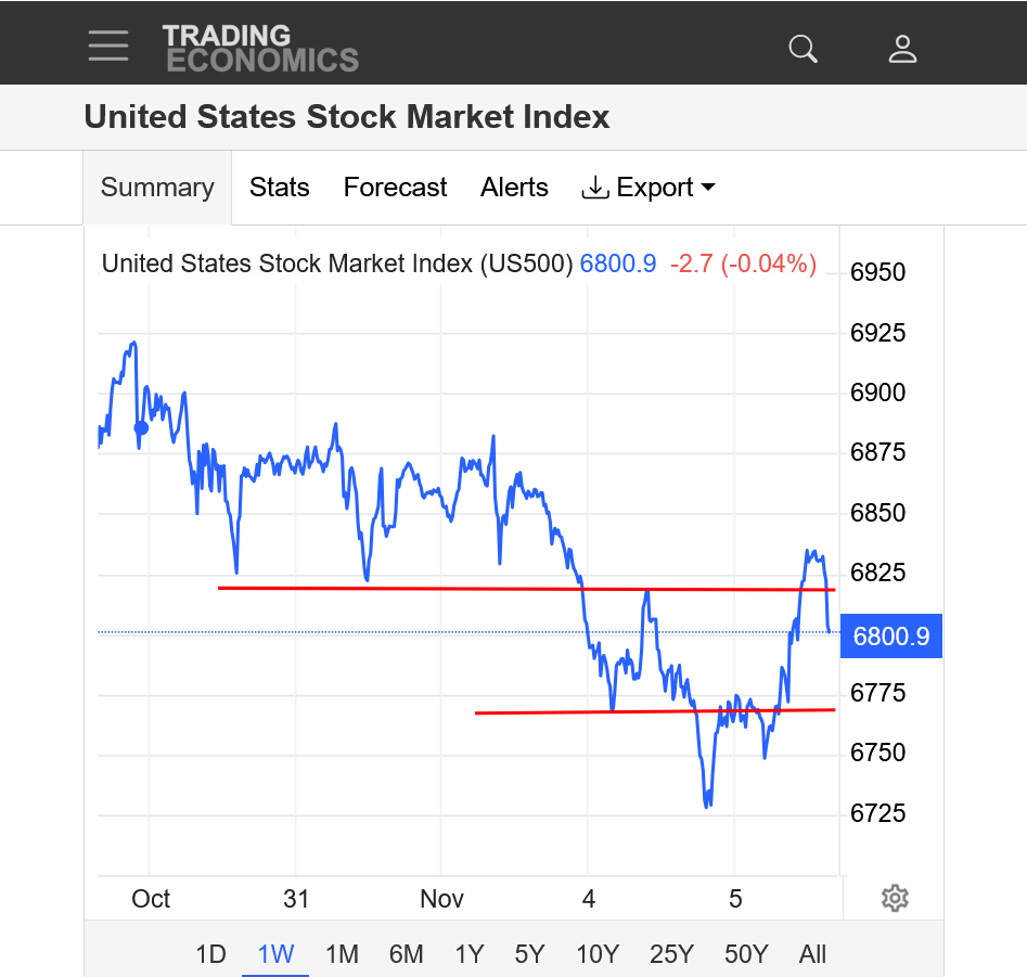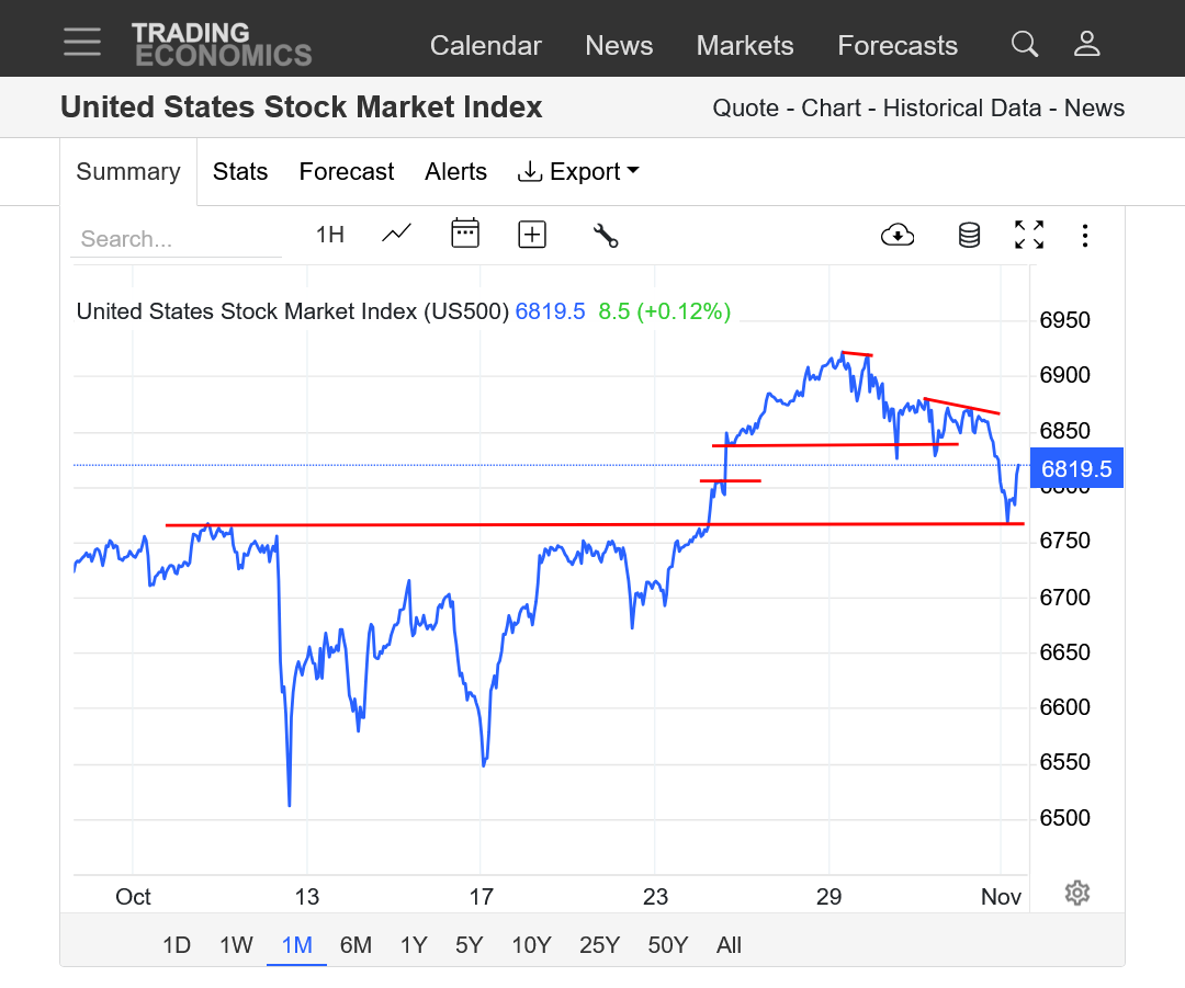 News could break us in either direction. News of the government shut down ending would take us to the upside since the extended shut down, negative tariff and economic news has somehow been unable to keep us down.......so far.